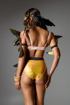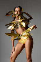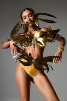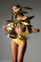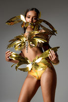 This Nia Sequin Stage Gold Outfit will bring you a unique sense of charm and luxury. The carefully designed golden butterfly sequin decoration adds dynamism and romance to the bikini, while the shining rhinestones make the overall look more dazzling and charming. Equipped with a unique butterfly face decoration, it perfectly echoes the overall design and shows the perfect fusion of exquisiteness and details.