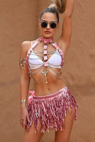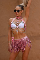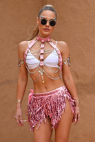 The perfect party set for the raver! Step into the spotlight with our dazzling festival set, featuring a striking pink harness top adorned with edgy silver chains and paired with a wrap sequin skirt that shimmers with every move. This bold ensemble is designed to make you the star of any festival or party, blending a fierce attitude with a touch of glam.