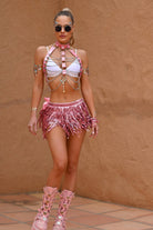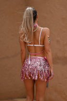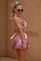- This set includes:Pink harness top and Wrap fringe sequin skirt pink