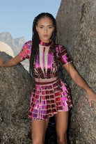 Shine bright at your next event with this bold and stunning Norah Mirror Sequin Dress In Pink. Crafted with metallic, sequin embellishments in a captivating pattern, this dress is designed for those who love to make a statement. The playful flared skirt and figure-flattering silhouette bring a touch of fun and elegance, perfect for parties, nights out, and special occasions. Featuring a high neckline and short sleeves, this dress combines a retro charm with modern style. Make every moment unforgettable with this show-stopping piece that guarantees all eyes will be on you.