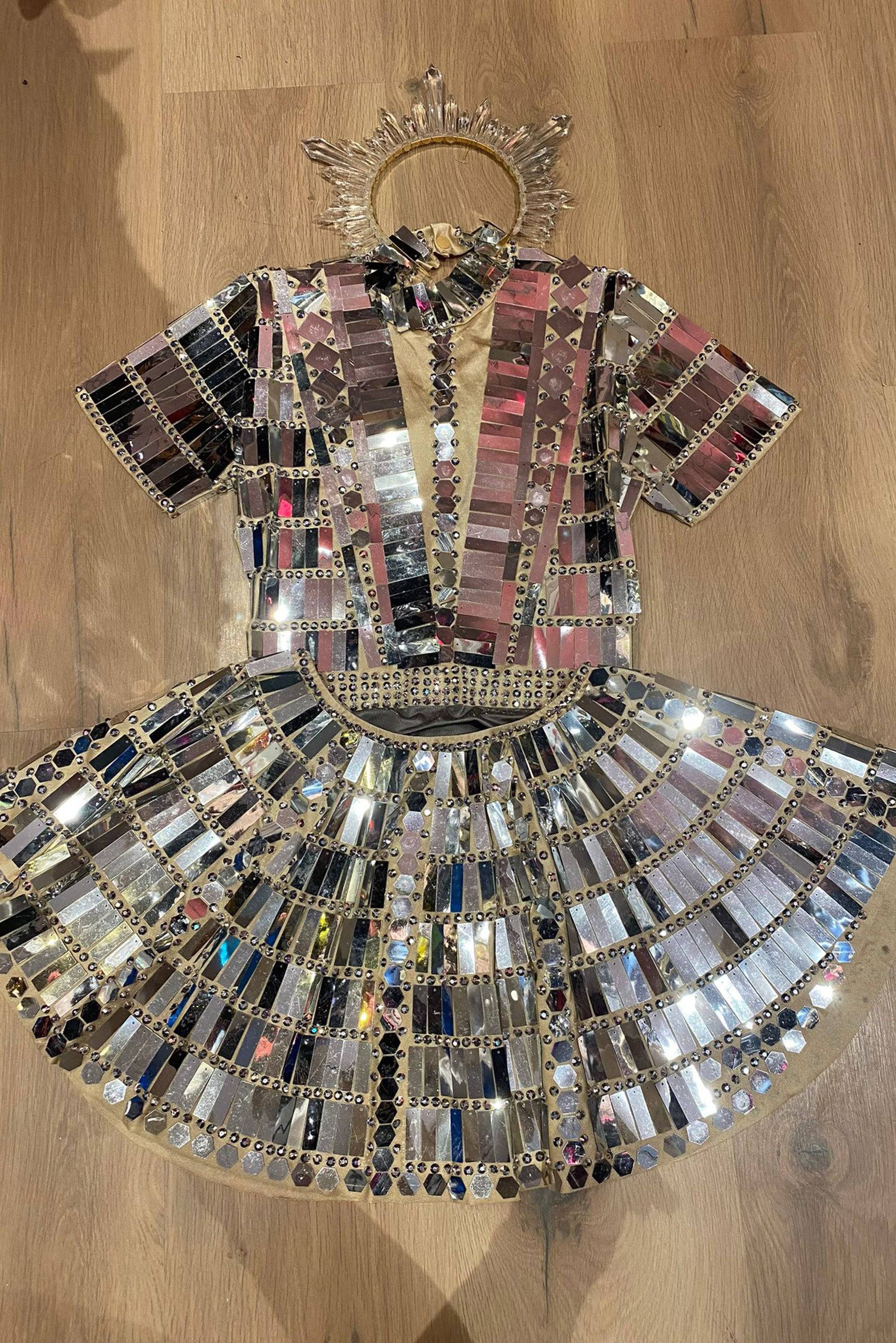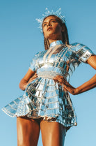 Turn heads with this stunning Norah Mirror Sequin Dress In Silver,The dress features a chic high-collar design, short sleeves, and a playful flared skirt adorned with shimmering mirror details and rhinestones. Perfect for festivals, parties, or a glamorous night out, this dress guarantees all eyes on you. The reflective surface of the mirror accents will ensure you sparkle under any light. this outfit creates a head-to-toe statement look for fashion-forward women