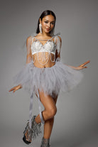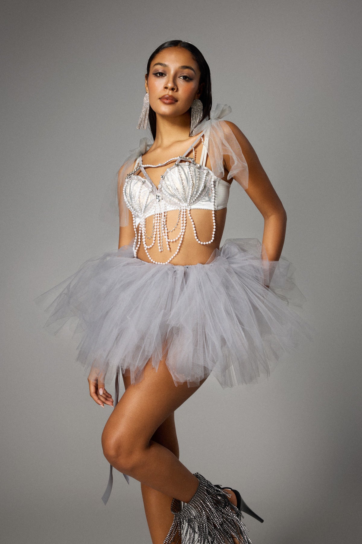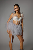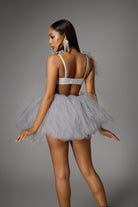 This perfect match of Raelynn Spaghetti Pearl Skirt Set gives people a romantic and fairy-like feeling. The top is decorated with exquisite pearls, and the elegant suspender design is combined with transparent gauze fabric to show the feminine softness and sexiness. The matching grey gauze skirt, the layered design adds a three-dimensional and fluffy feeling, bringing a light and elegant visual effect. Whether it is a ball, party or special celebration, this dress can make you the focus and show a unique charm.