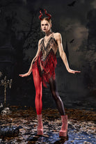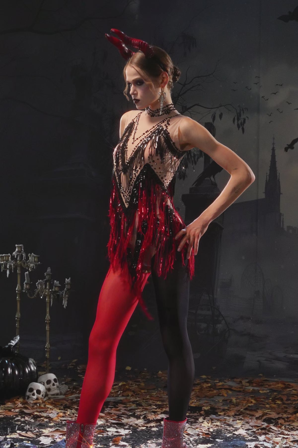 Make every move a dazzling spectacle with the Reid Sleeveless Fringe Rhinestone Bodysuit. This eye-catching piece, adorned with shimmering rhinestones and vibrant fringe, will dazzle with every step and every turn. The sleeveless, form-fitting silhouette not only enhances your curves but also provides comfort for energetic performances, dance recitals, or nightlife events.