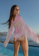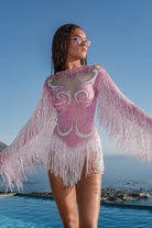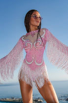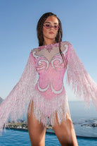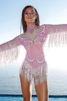 Be the center of attention in our Reyna Fringe Rhinestone Bodysuit Pink - the epitome of festive fashion for women. Perfect for parties, New Year's Eve and any occasion that calls for a unique outfit. Featuring full coverage light pink spandex, this rave outfit is embellished with hand-bonded rhinestones and pearls, while the fringe on the sleeves and hanging at the hips creates a glamorous movement, enhancing your presence on the dance floor and exuding glamor.