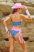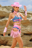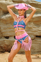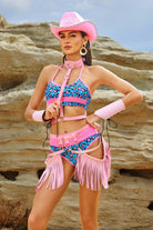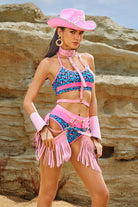 Be the center of attention with the River Wild Western Leopard Outfit. Perfect for performers who love to make a bold entrance, this wild six-piece outfit combines cowgirl vibes with the energy of a wild feline. The backless leopard crop top pairs easily with the matching high-waisted shorts for a glamorous look, while the wide-brimmed hat adds to the iconic Western vibe. The matching matching choker, waist chain and exaggerated sleeves sparkle and sway in every detail. Whether you're on stage, at a themed event or on the dance floor, this look will have you sprinting and shining.