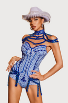 Channel the glamour of pop diva Sabrina Carpenter in our Sadie Off Shoulder Crystal Bodysuit Blue. This stunning bodysuit is embellished with crystals/rhinestones in perfectly arranged, flattering, structured bustier-style designs. Bold off-shoulder cutouts and delicate crystal straps create a gorgeous, modern pop star style. Made from comfortable stretch fabric, it's designed for gigs, festivals, and anywhere you want to turn heads. Whether you're on stage, at a concert, or celebrating a special night out, this bodysuit will give you the ultimate in sparkle and star power.