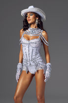 Channel the glamour of pop diva Sabrina Carpenter in our Sadie Off Shoulder Crystal Embellished Bodysuit. This stunning bodysuit is embellished with crystals/rhinestones in perfectly arranged, flattering, structured bustier-style designs. Bold off-shoulder cutouts and delicate crystal straps create a gorgeous, modern pop star style. Made from comfortable stretch fabric, it's designed for gigs, festivals, and anywhere you want to turn heads. Whether you're on stage, at a concert, or celebrating a special night out, this bodysuit will give you the ultimate in sparkle and star power.
