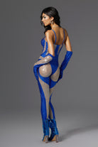 Take center stage in this dazzling Scarlett Spaghetti Rhinestone Jumpsuit In Blue, designed to be the ultimate in glamour. With delicate spaghetti straps and glittering rhinestones, this jumpsuit combines elegance and boldness for an unforgettable performance experience. Inspired by Dua Lipa's modern fashion style, this jumpsuit is the perfect blend of edgy design and feminine glamour, perfect for stage performances, special events or photo shoots.