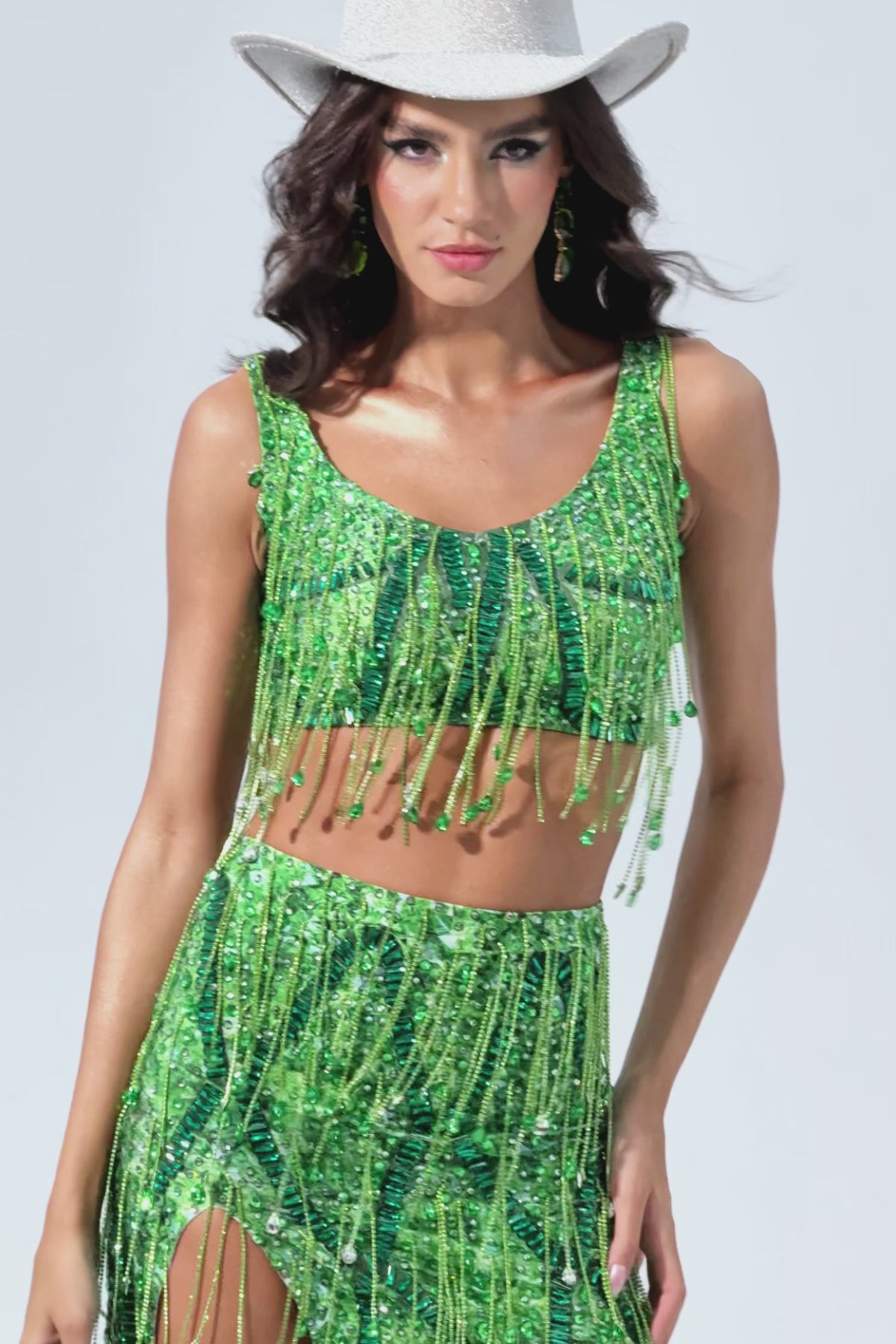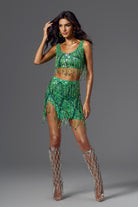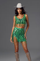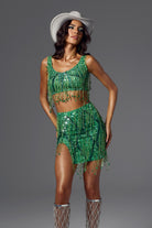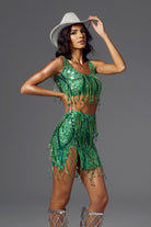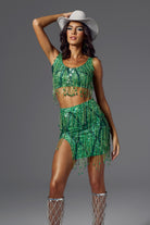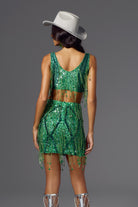 Sofia Fringe Backless Skirt Set Green-Bold & Glamorous Performance Skirt Set Perfect for Stage Shows