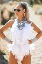 Become a living sculpture of light and movement in the Thalia Feather Rhinestone Bodysuit White, a luxurious performance garment with gravity, perfect for festivals, Halloween parties, birthday parties and more. This bodysuit combines the drama of an open back with hand-bonded rhinestones and beautiful white feathers, perfect for stage performances and dancers.