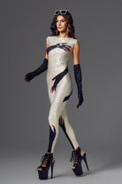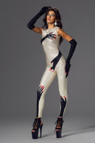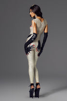 You'll be the center of attention in this stunning Violet Sleeveless Rhinestone Jumpsuit In Nude, inspired by Beyoncé's wild and glamorous style. This sleeveless jumpsuit is covered in sparkling rhinestones, making it the ultimate stage presence. The bold nude colorway and slim fit make it perfect for performers looking to make a splash.