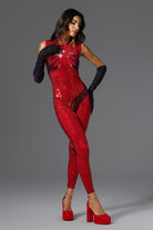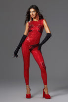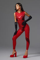 You'll be the center of attention in this stunning Violet Sleeveless Rhinestone Jumpsuit In Red, inspired by Beyoncé's wild and glamorous style. This sleeveless jumpsuit is covered in sparkling rhinestones, making it the ultimate stage presence. The bold red colorway and slim fit make it perfect for performers looking to make a splash.