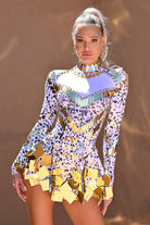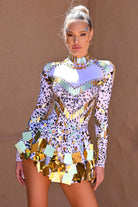 This Zuri Sequin Long Sleeve Dress Gold features a high collar and long sleeves, creating an elegant and capable temperament. The skirt is decorated with gold and silver mirror sequins, which shine in the light and show a luxurious aura. The slim fit perfectly outlines the curves, and the three-dimensional geometric sequin design on the hem gives the overall shape a unique dynamic feel, and every step is full of charm. It is suitable for parties, stage performances, festivals and other high-profile occasions, making you the focus of the audience.