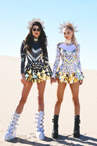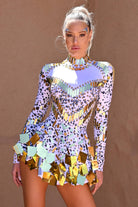 - Design highlights: white base, gold and silver mirror sequins inlay, high-neck long sleeves, sexy short dress