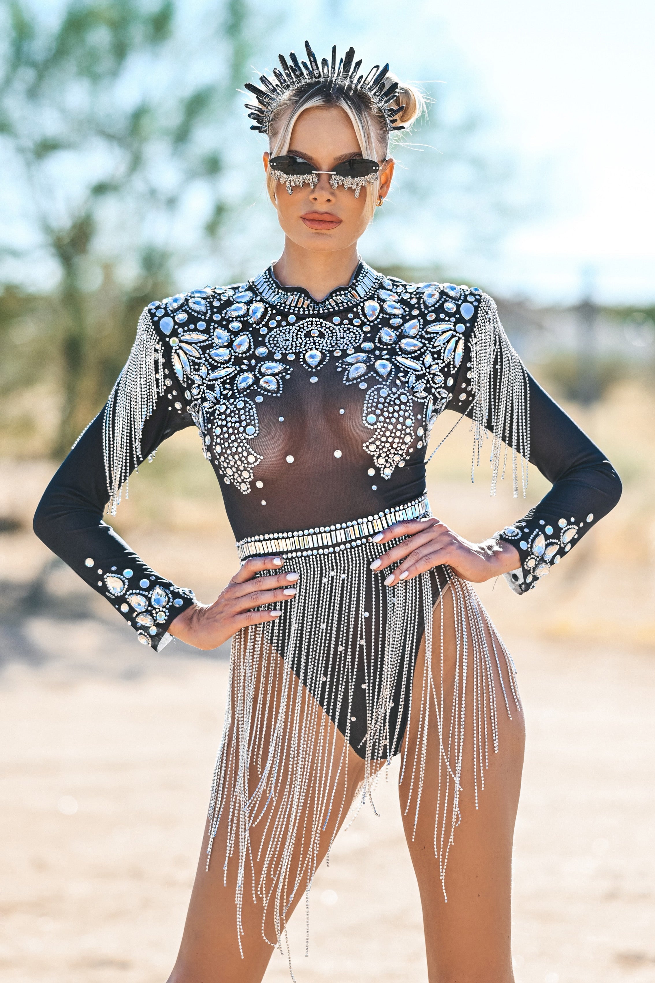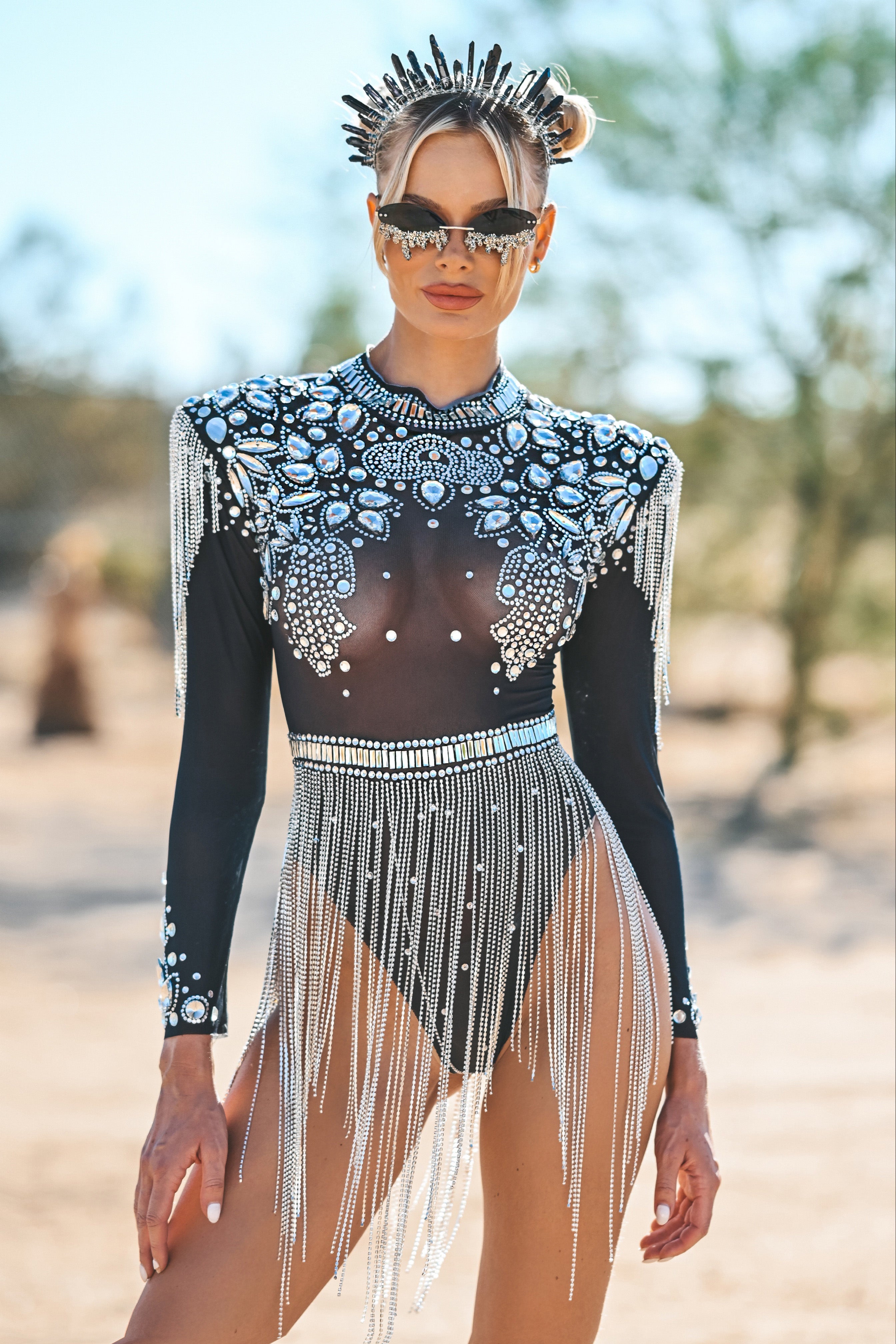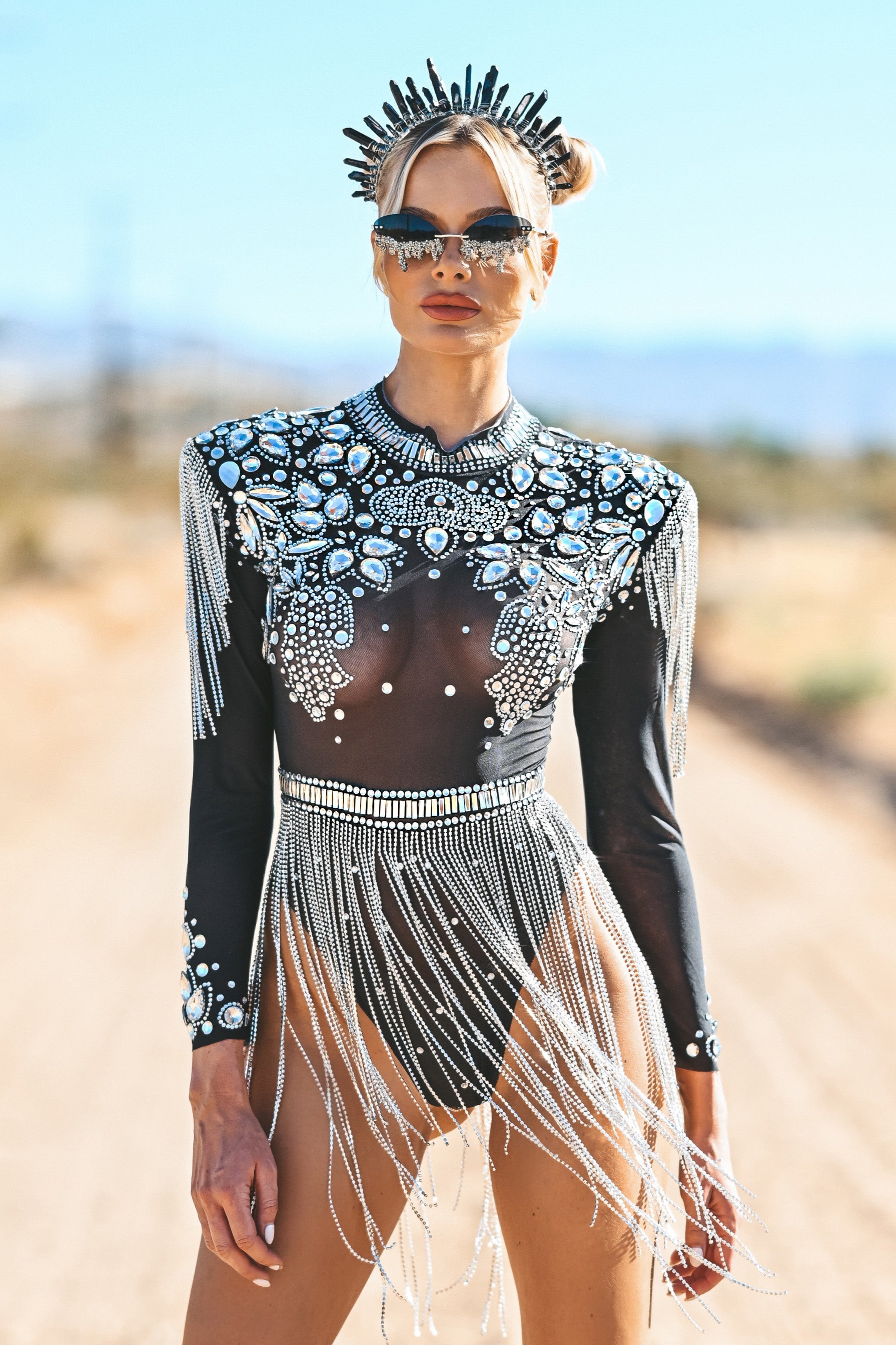 Legacy Mesh Rhinestone Fringe Bodysuit Black