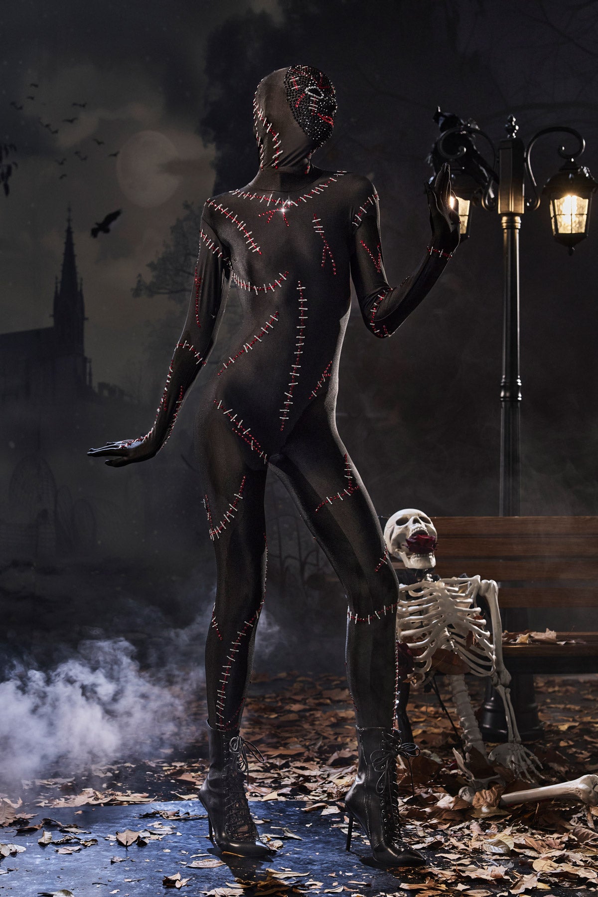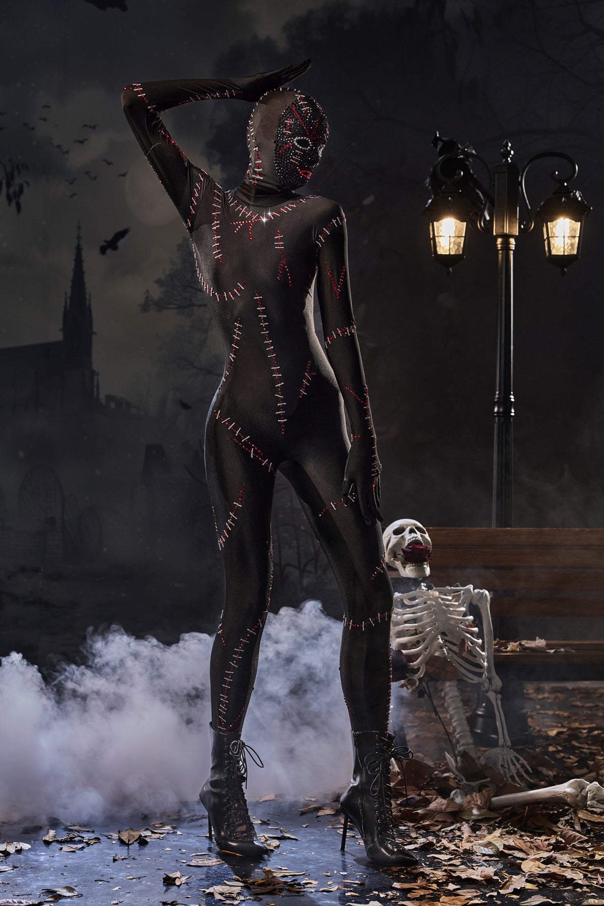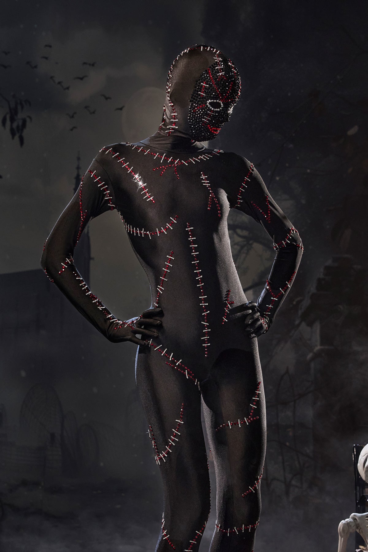 Stand out boldly in the Cash Long Sleeve Jumpsuit with Headgear. This jumpsuit features a chilling design that captures the eerie effect of stitched skin. Bold scar stitching prints run throughout the body for a spooky effect, while the matching headgear completes the look for a truly striking visual impact. Made from stretchy, breathable fabric, this jumpsuit is comfortable without sacrificing its spooky aesthetic. Perfect for Halloween, haunted house stage shows, or spooky party entrances.