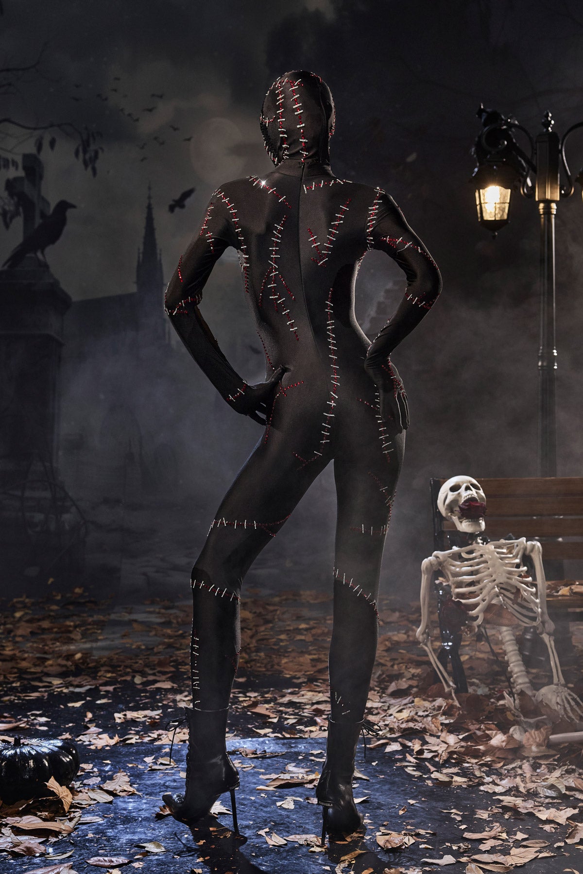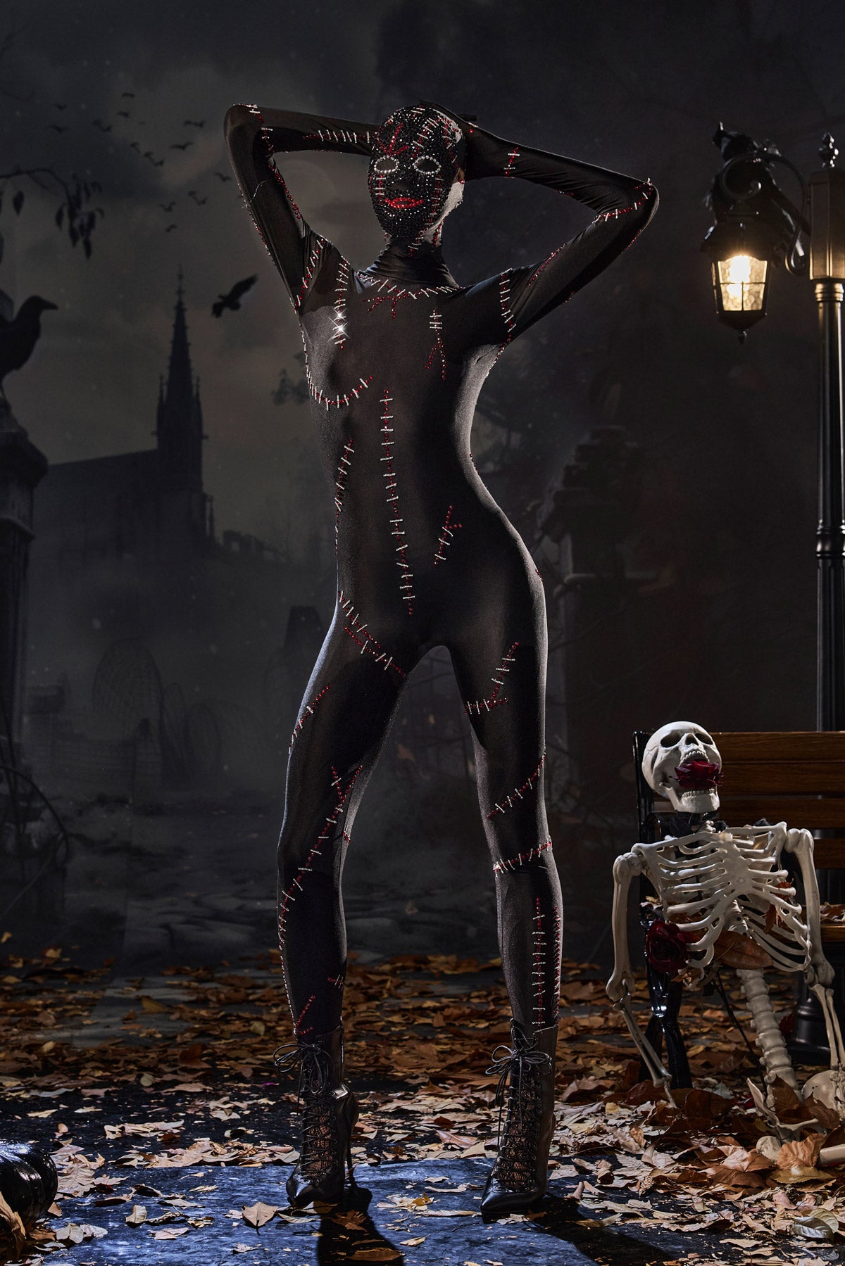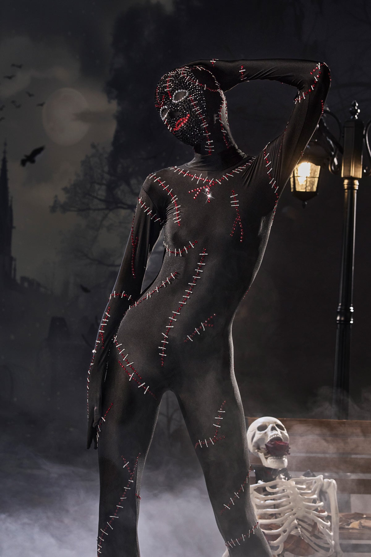 Stand out boldly in the Cash Long Sleeve Jumpsuit with Headgear. This jumpsuit features a chilling design that captures the eerie effect of stitched skin. Bold scar stitching prints run throughout the body for a spooky effect, while the matching headgear completes the look for a truly striking visual impact. Made from stretchy, breathable fabric, this jumpsuit is comfortable without sacrificing its spooky aesthetic. Perfect for Halloween, haunted house stage shows, or spooky party entrances.