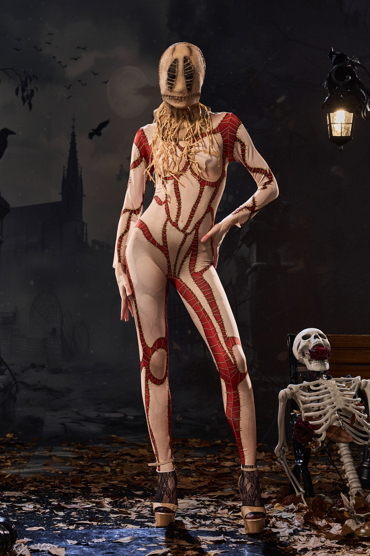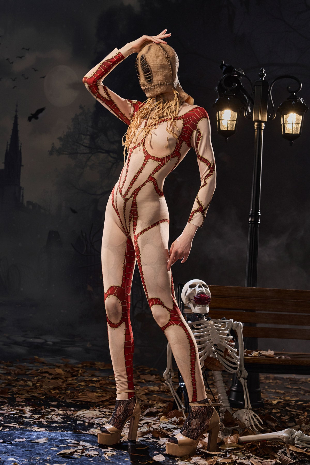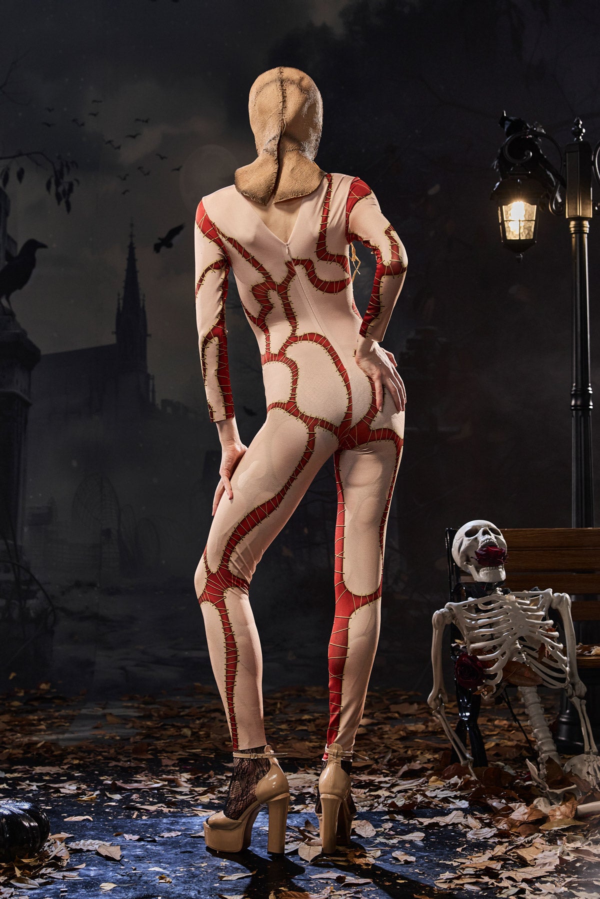 Embrace the eerie charm of this Crew Long Sleeve Printed Jumpsuit. Its ripped and stitched print perfectly embodies the chaotic spirit of clown fashion. This long-sleeved jumpsuit, featuring a bold, ripped, illusion-like effect, embodies the unsettling aura of stitched garments, perfect for spooky clown shows, Halloween performances, or edgy nightlife looks. Formfitting stretch fabric enhances your silhouette, while the exaggerated print creates a dramatic impact.