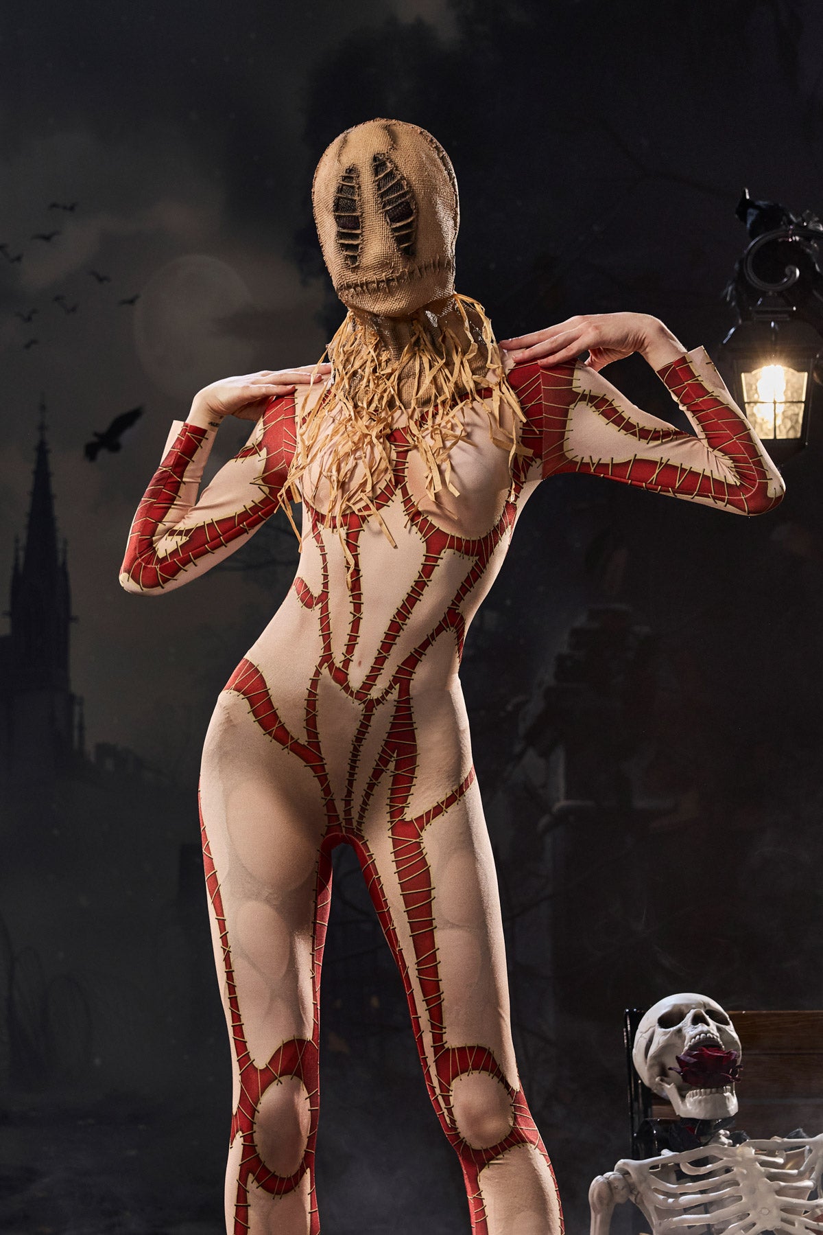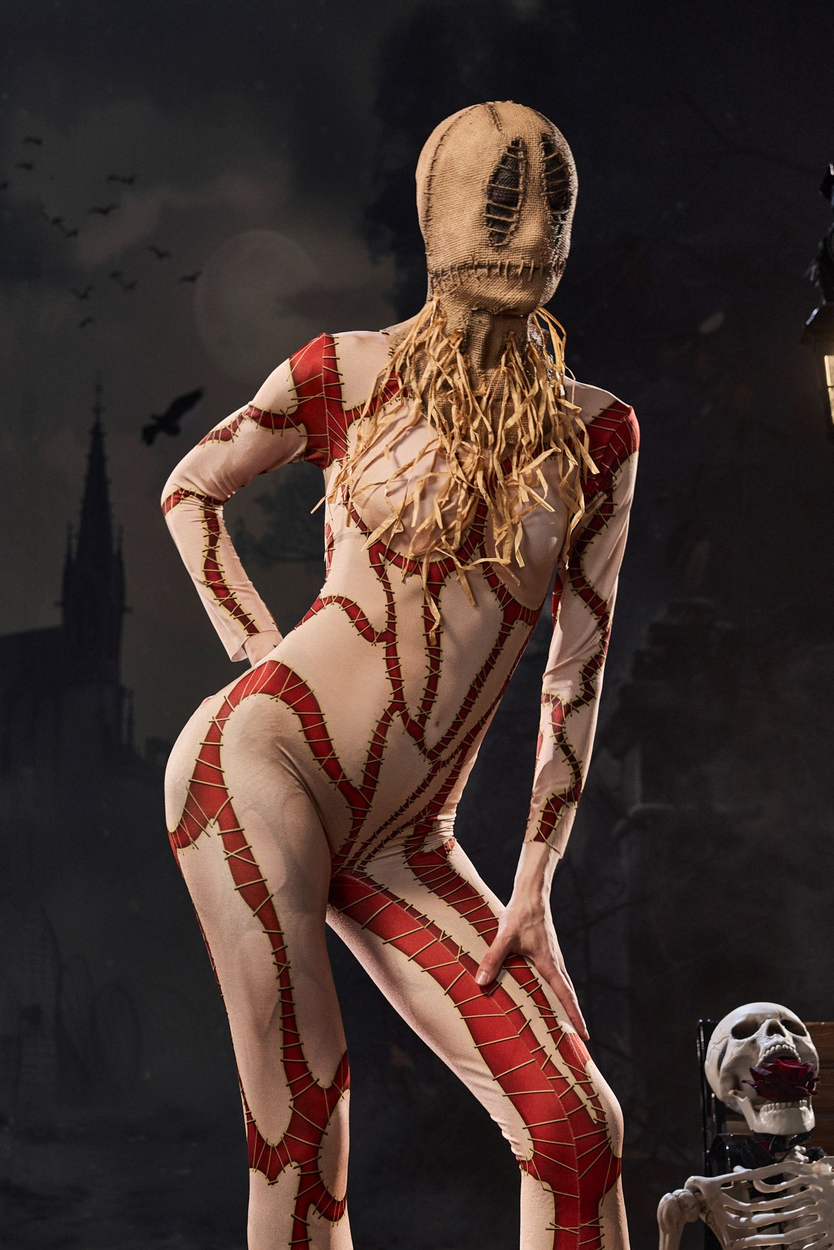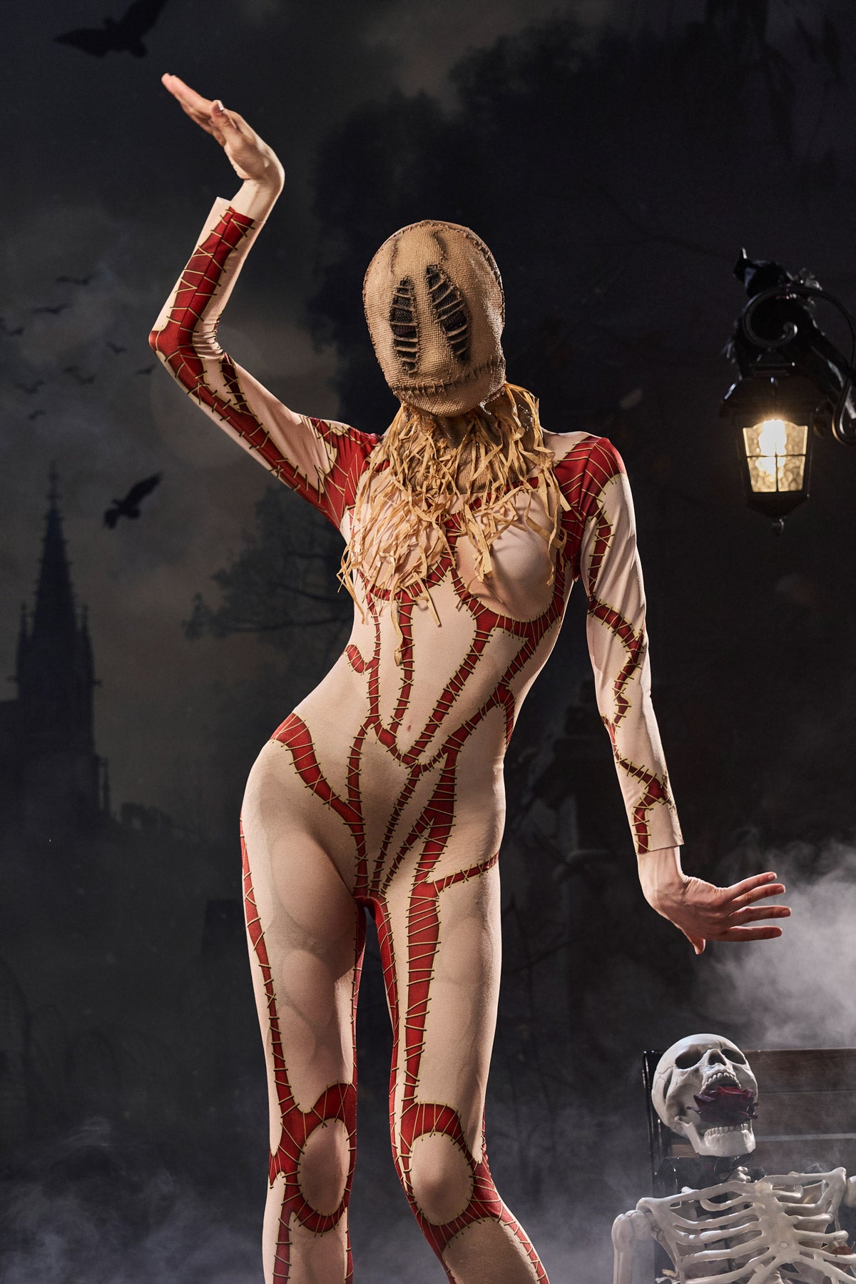 Embrace the eerie charm of this Crew Long Sleeve Printed Jumpsuit. Its ripped and stitched print perfectly embodies the chaotic spirit of clown fashion. This long-sleeved jumpsuit, featuring a bold, ripped, illusion-like effect, embodies the unsettling aura of stitched garments, perfect for spooky clown shows, Halloween performances, or edgy nightlife looks. Formfitting stretch fabric enhances your silhouette, while the exaggerated print creates a dramatic impact.