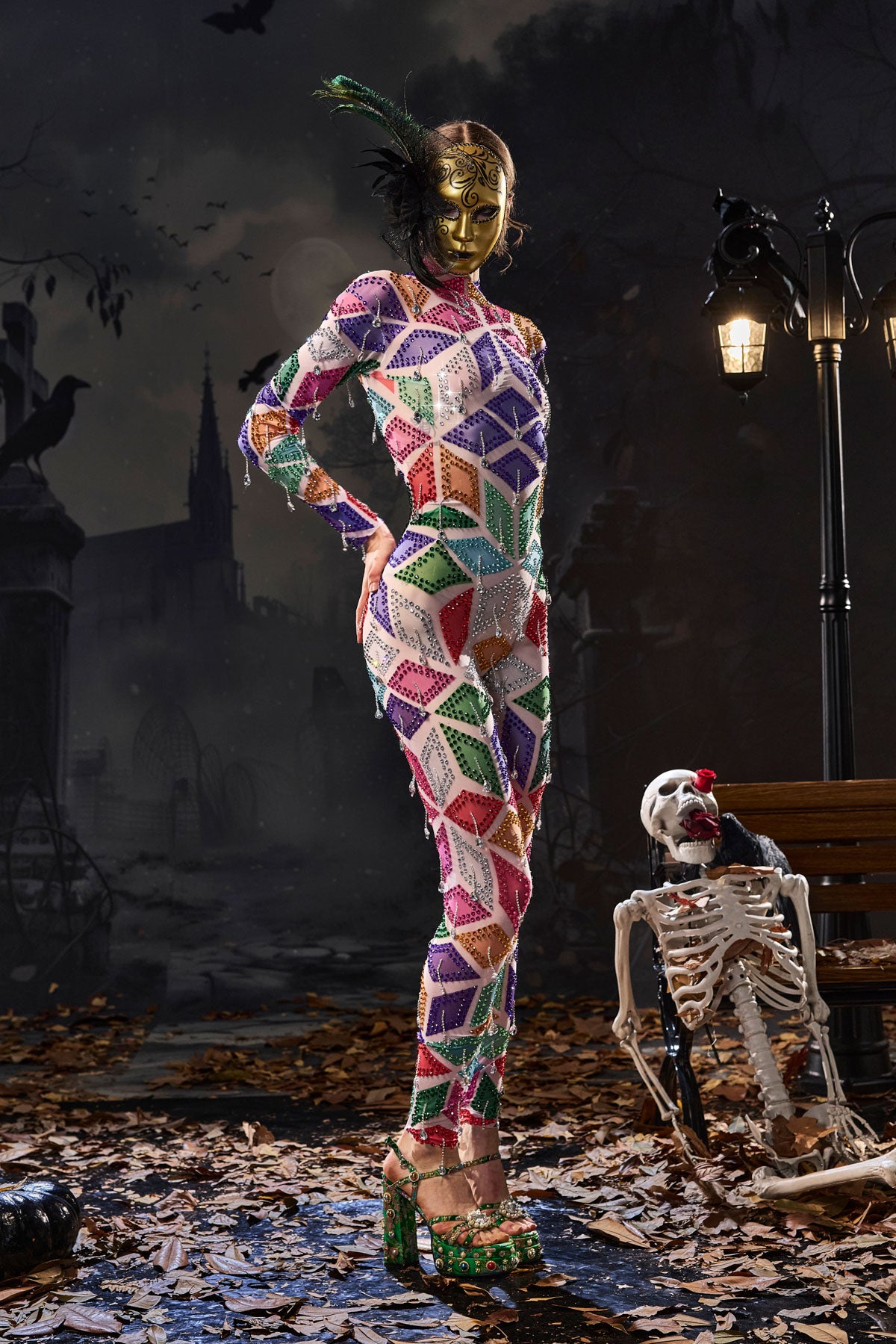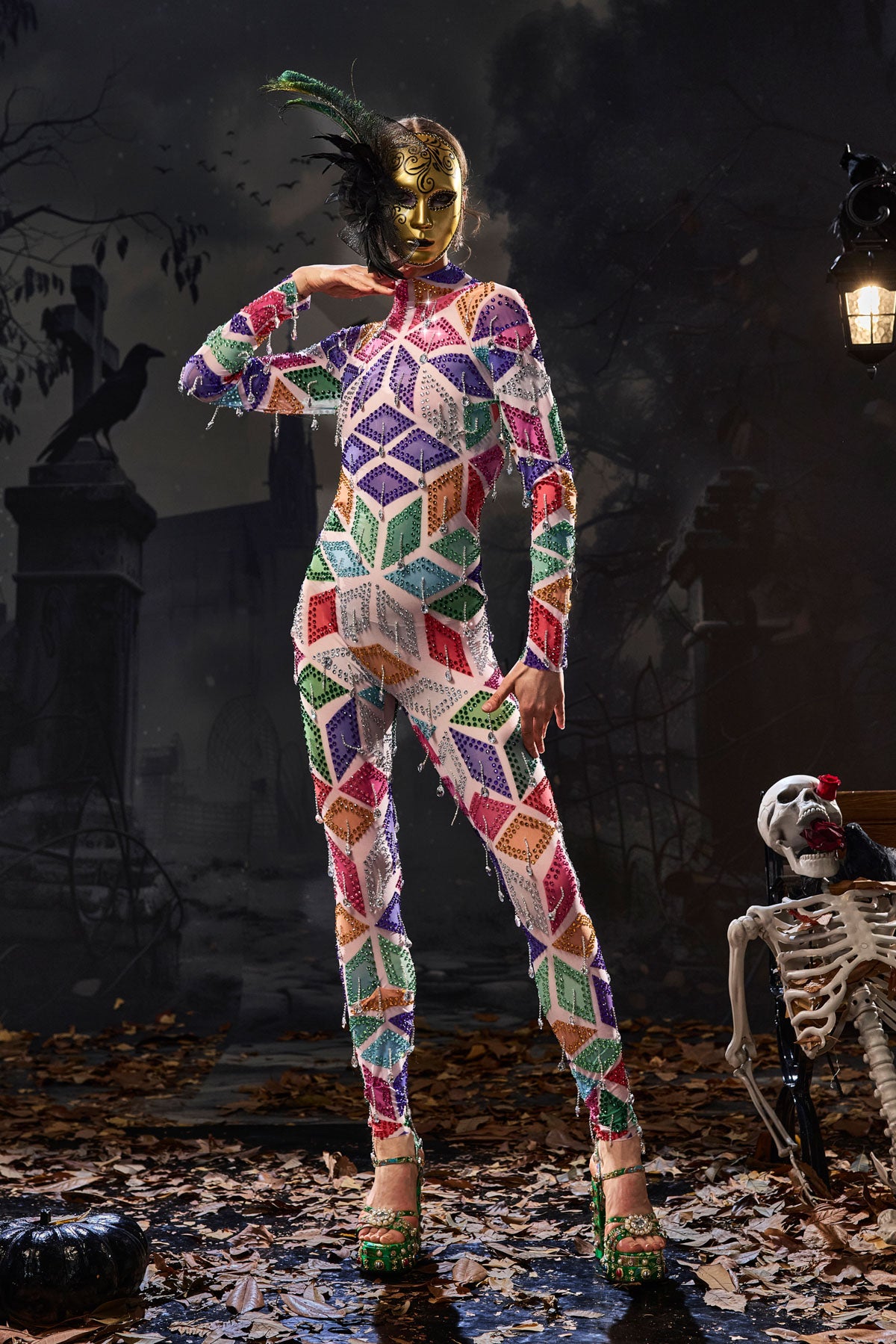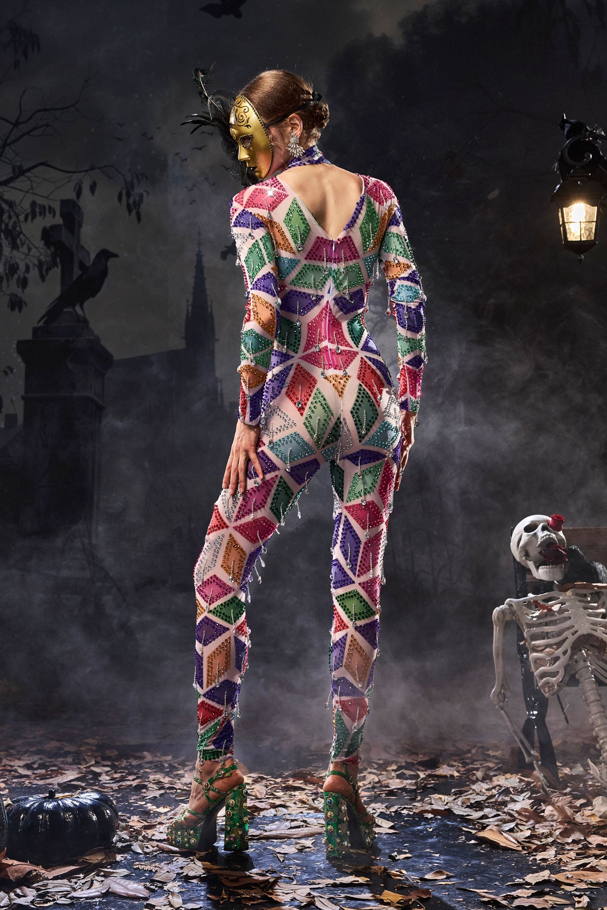 The Sergio Mesh Rhinestone Jumpsuit In Multi, embellished with multicolored rhinestones, dazzles from every angle. This long-sleeved jumpsuit is crafted from sheer mesh and embellished with vibrant rhinestones for a dazzling stage look. Designed for performers, dancers, and nightlife enthusiasts, the sleek, form-fitting silhouette accentuates curves and reflects light with every move.