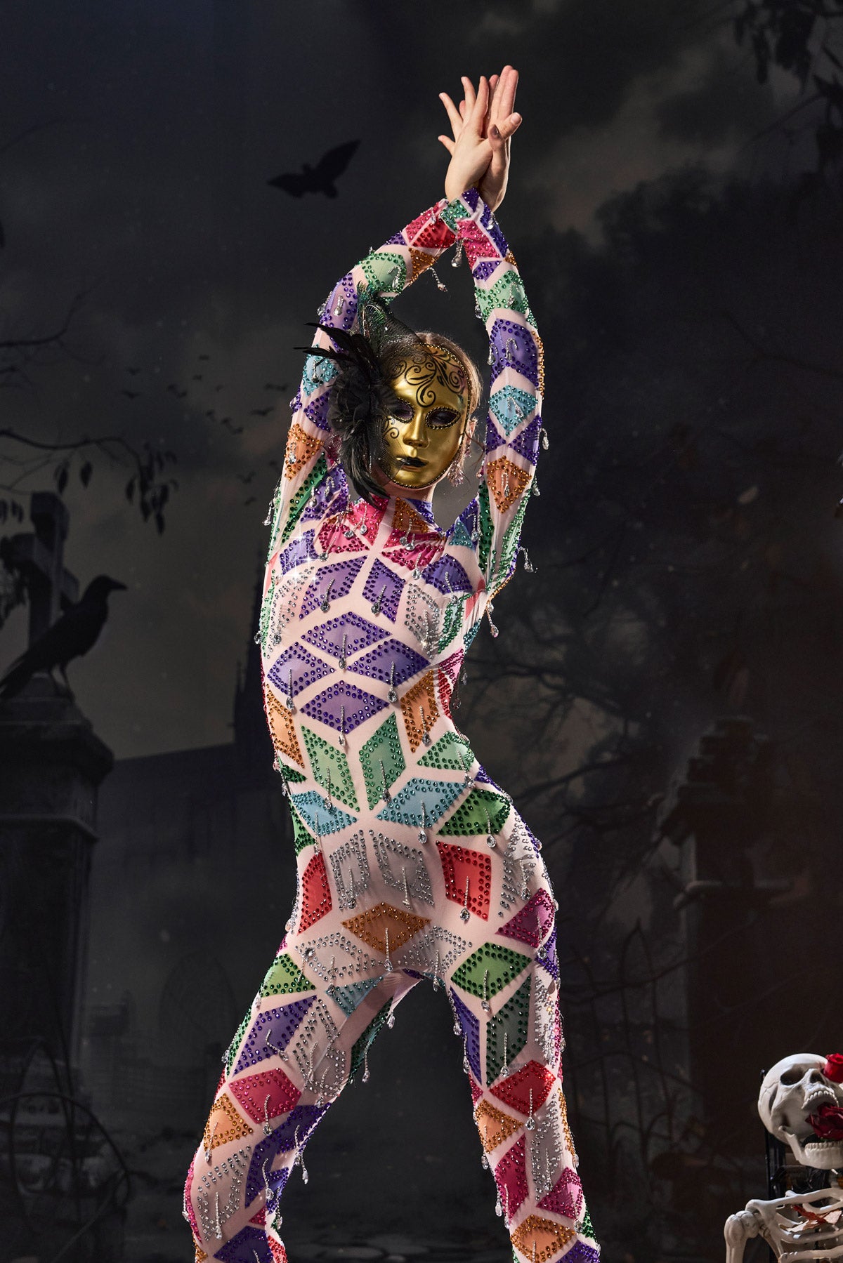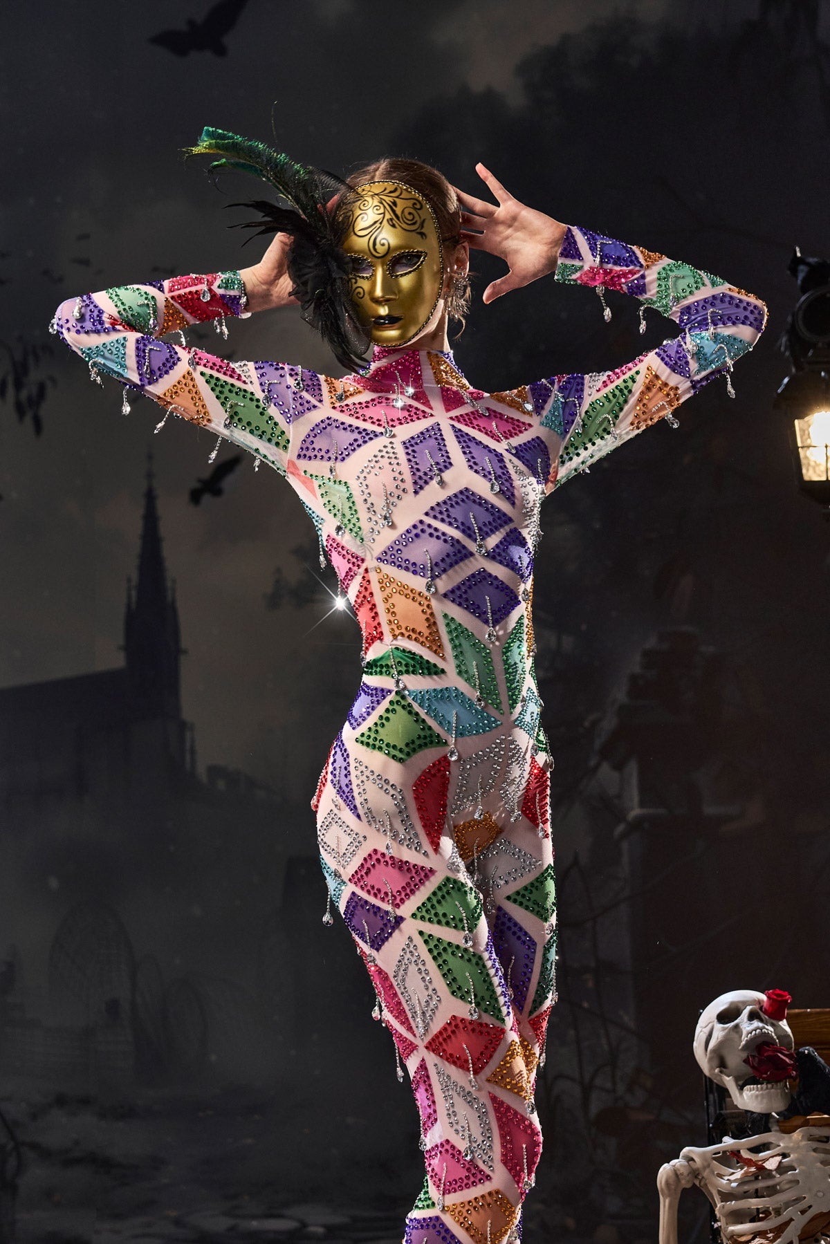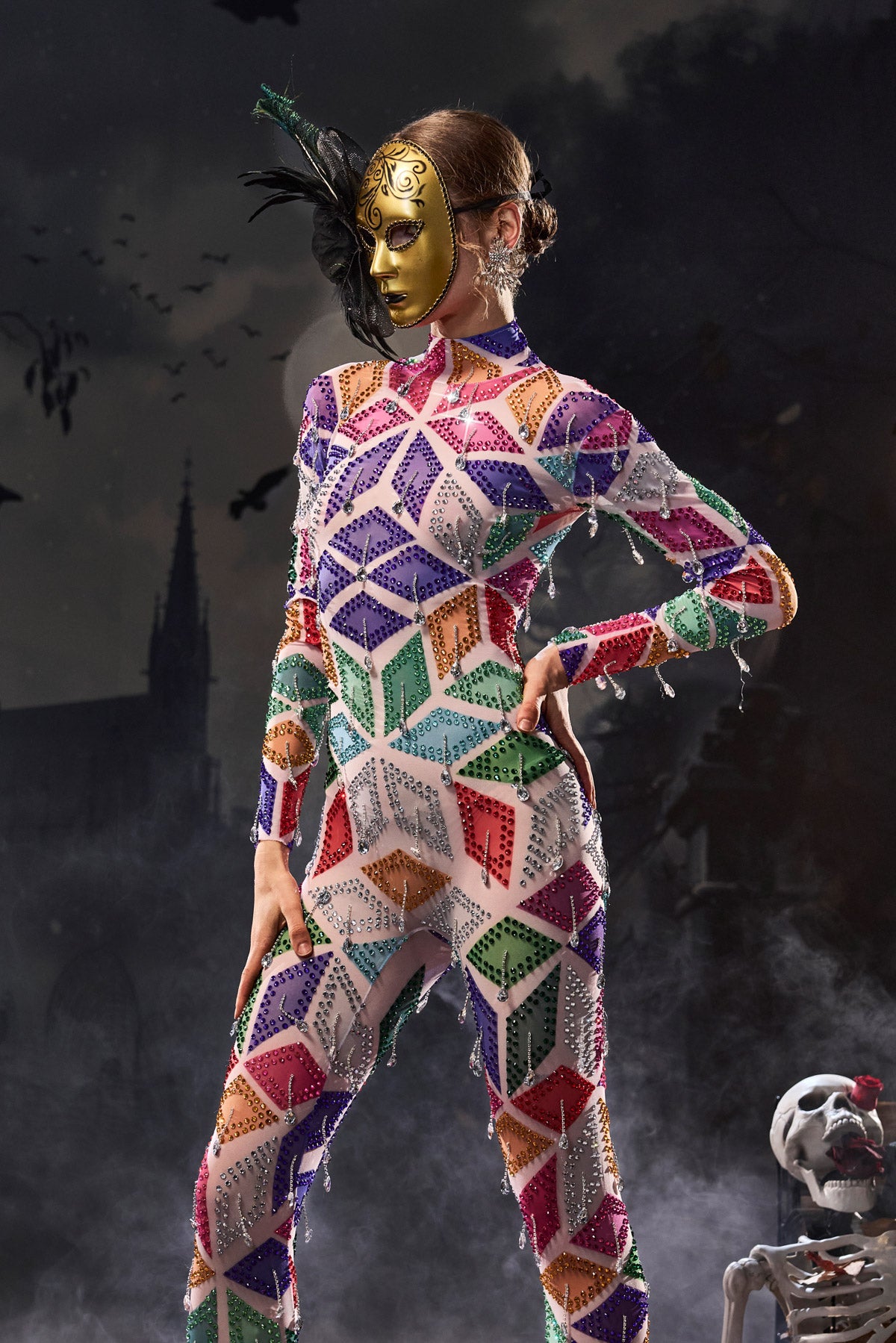 The Sergio Mesh Rhinestone Jumpsuit In Multi, embellished with multicolored rhinestones, dazzles from every angle. This long-sleeved jumpsuit is crafted from sheer mesh and embellished with vibrant rhinestones for a dazzling stage look. Designed for performers, dancers, and nightlife enthusiasts, the sleek, form-fitting silhouette accentuates curves and reflects light with every move.