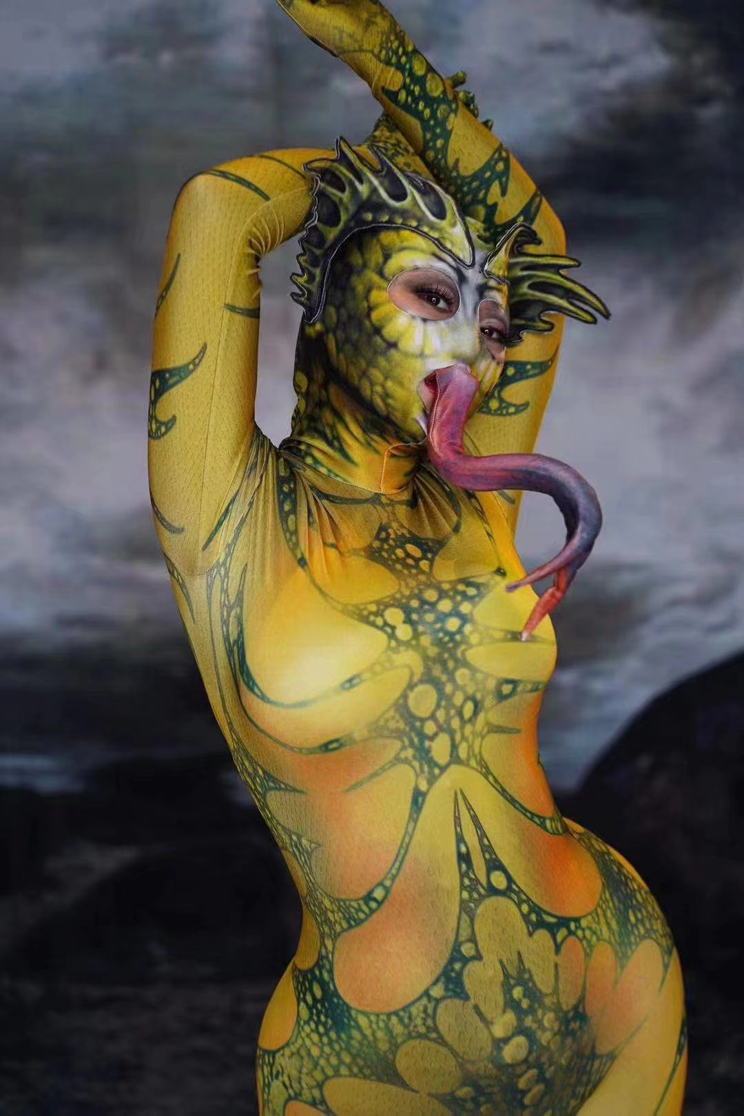 Step into the wild world with this ultra-realistic Theodora Long Sleeve Printed Jumpsuit - this stunning reptile look is perfect for performers, cosplayers and Halloween queens. Designed with a vibrant chartreuse scale print that mimics lizard skin, this full-body jumpsuit features an integrated lizard mask and an elongated 3D tongue for dramatic effect. Made from premium fabric that accentuates your curves while allowing for full range of motion, this jumpsuit is perfect for dance performances, drag acts, fantasy role play or social media sensations. Unleash your inner reptile and dominate the stage!