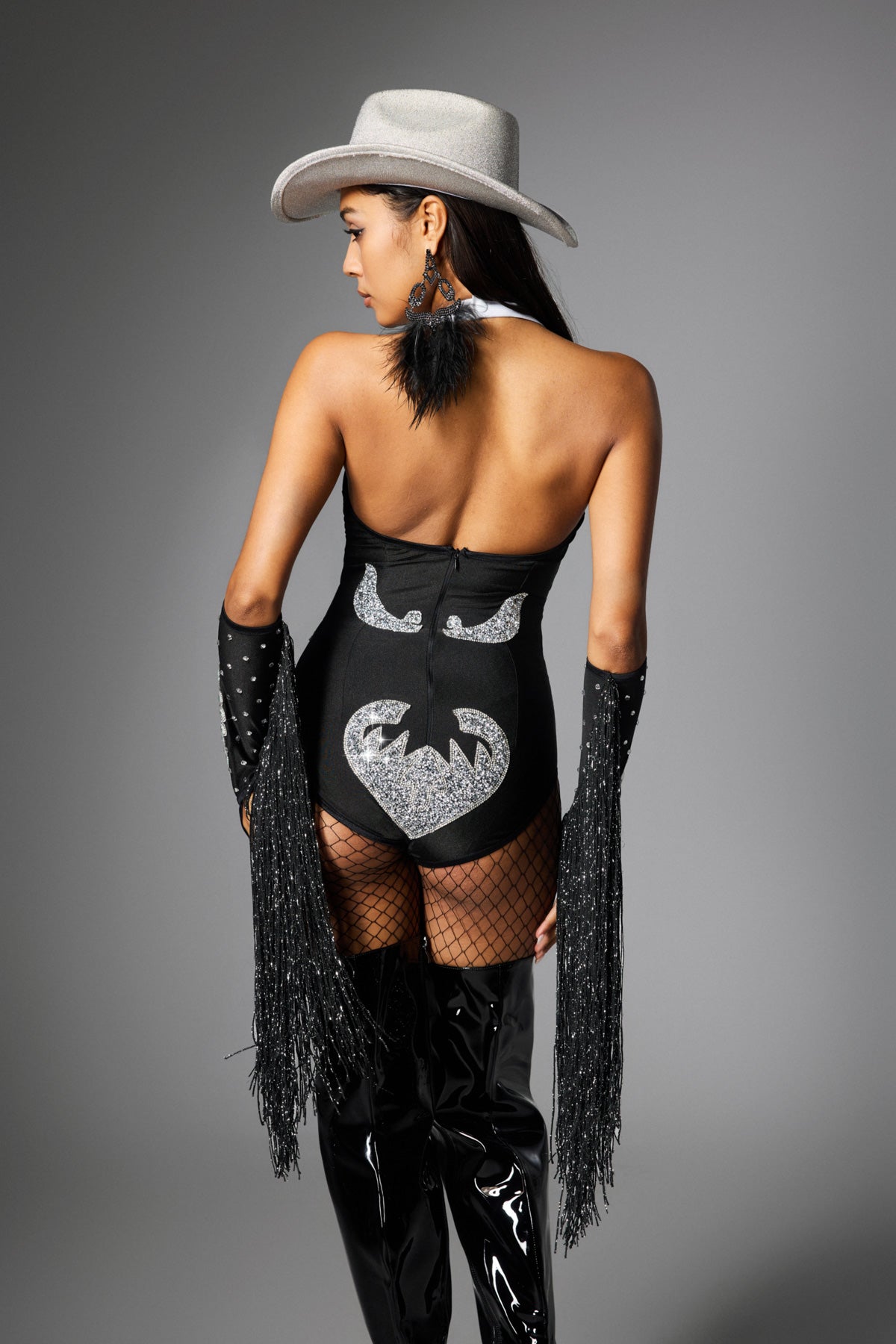 This Cecilia Halter Neck Rhinestone Bodysuit is specially designed for the queen of the stage. It is made of high elastic fabric, fits comfortably, and outlines a charming figure. Exquisite rhinestones are inlaid all over the body, shining under the lights, helping you become the focus. The halter neck design is elegant and sexy, showing the charming shoulder and neck lines, and paired with the same tassel gloves, adding dancing charm. Whether it is a stage performance, a nightclub party or a dance performance, this jumpsuit can make you stand out from the crowd and show your confident style!