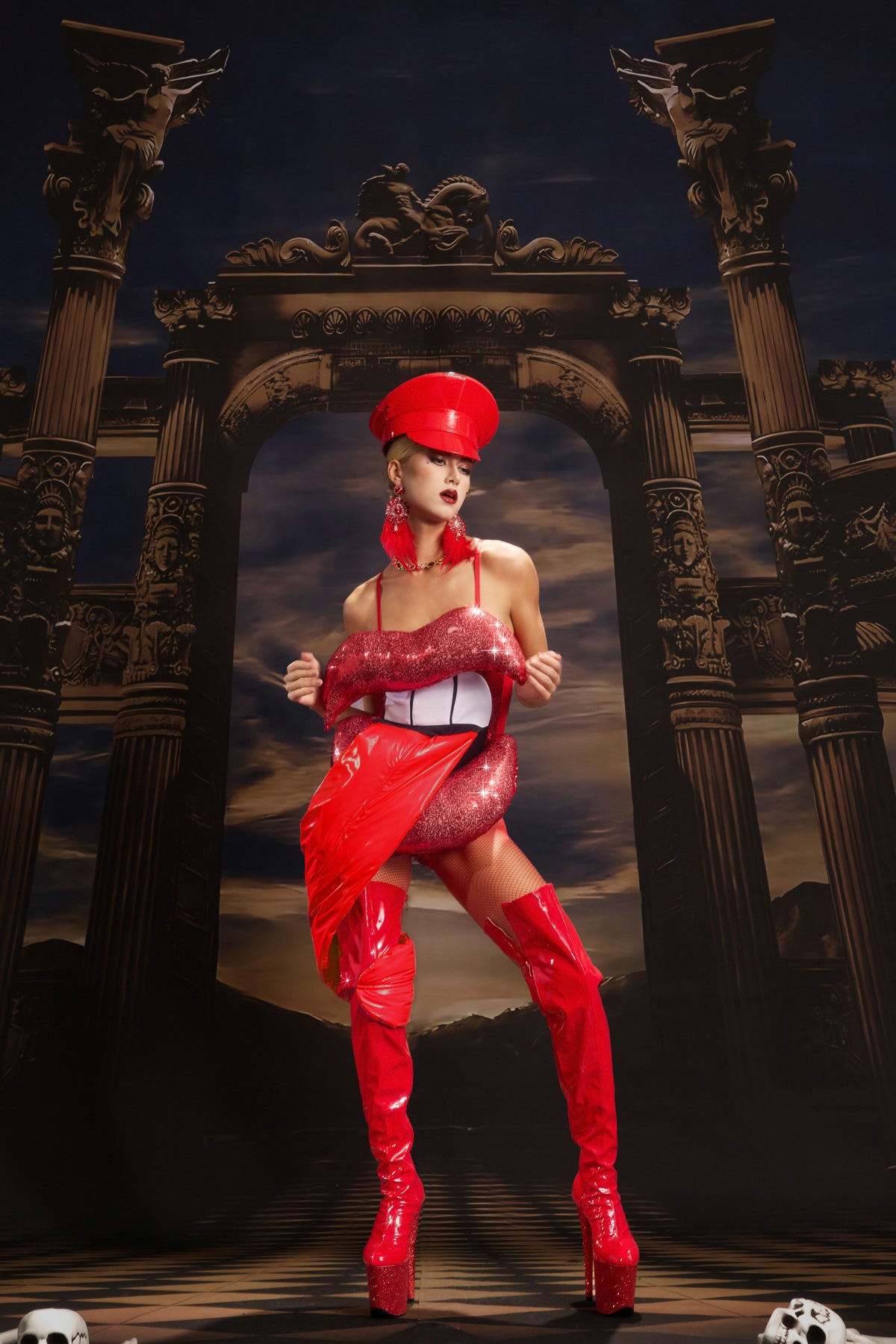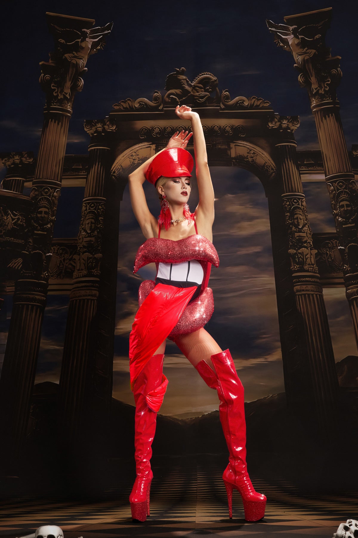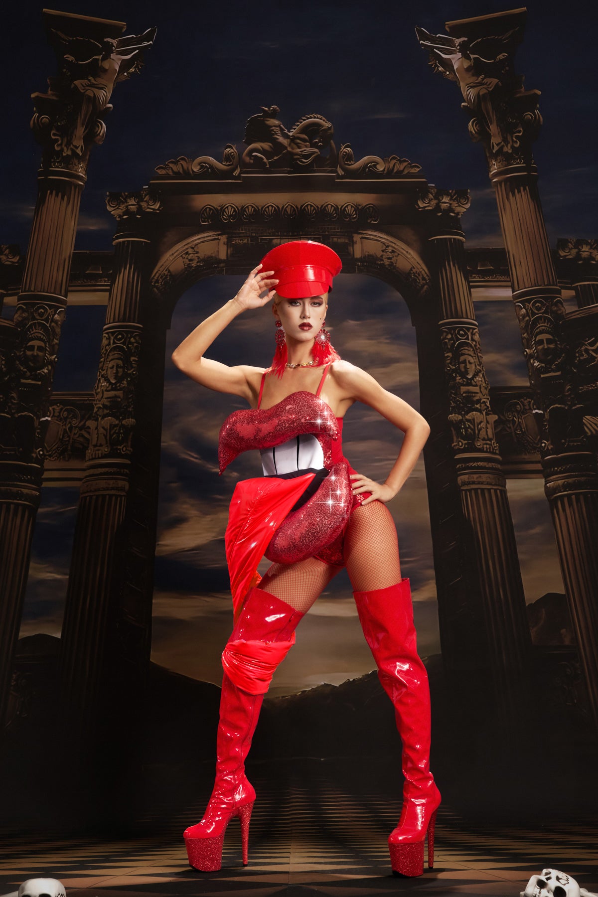 Be the center of attention in the Lyanna Spaghetti Sequin Bodysuit In Red. A stunning piece designed for fearless performers and fashionistas. With a bright red sequin lip graphic and striking 3D red tongue detail, this bodysuit makes a bold statement and extreme glamour. The sculpted lip structure and extended tongue create a dramatic silhouette perfect for drag shows, costume parties or music videos. Elastic straps ensure a secure fit while allowing arms and legs to move freely. Whether you're on stage or posing, this bodysuit makes it easy to get maximum attention.