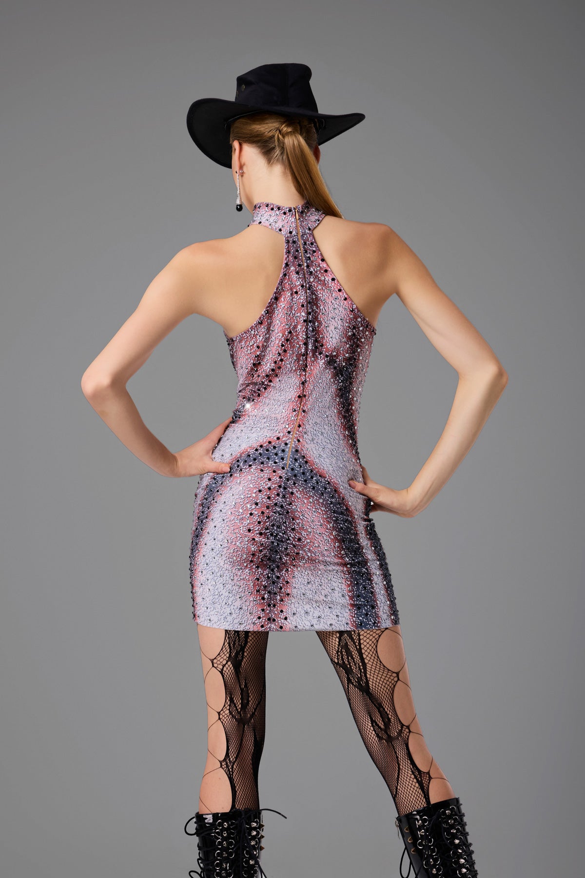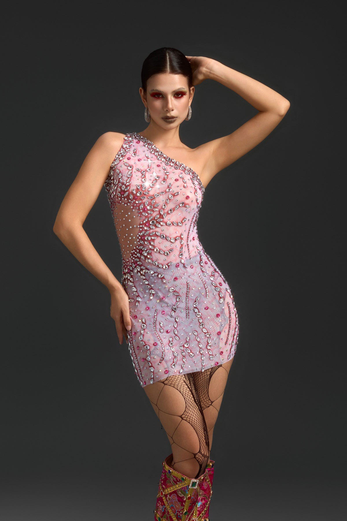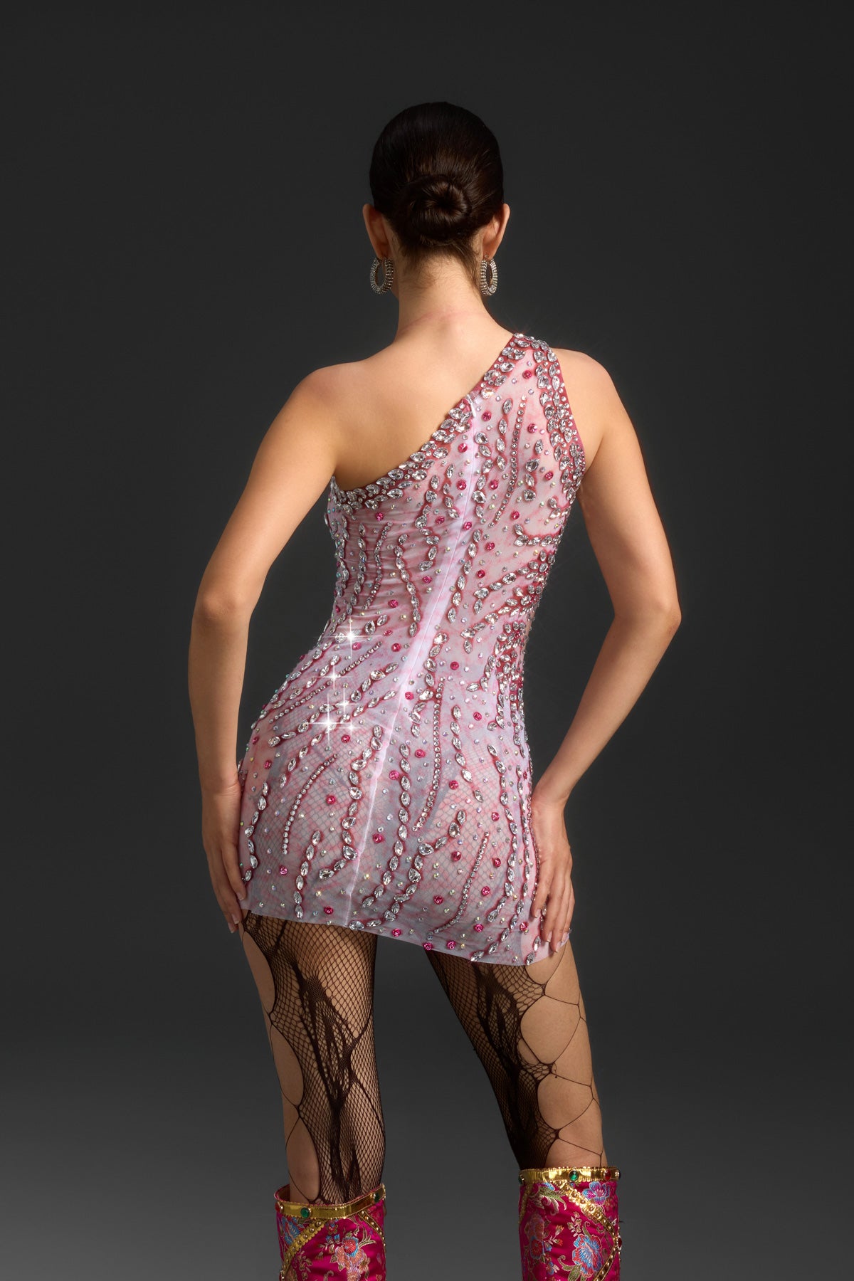 Omera Spaghetti Rhinestone Mesh Mini Dress