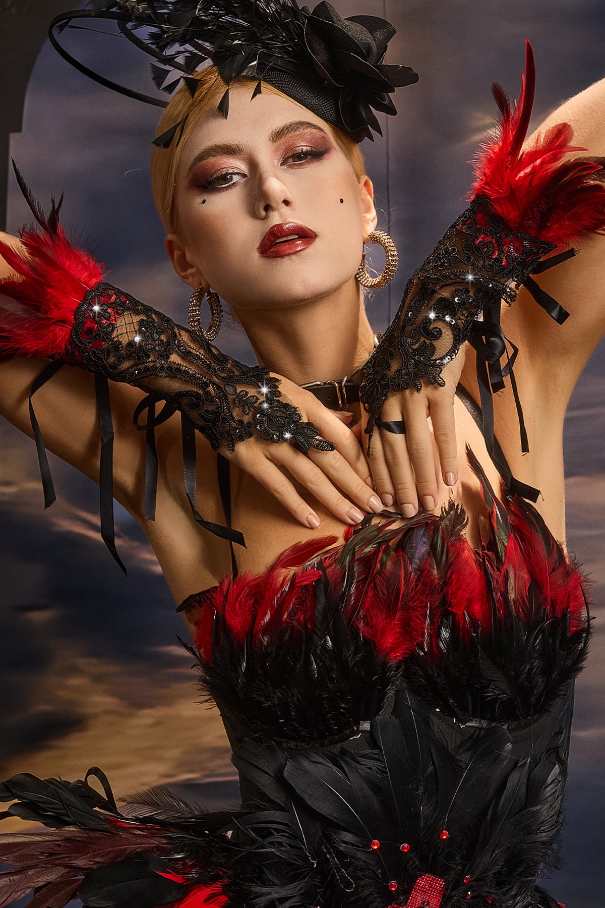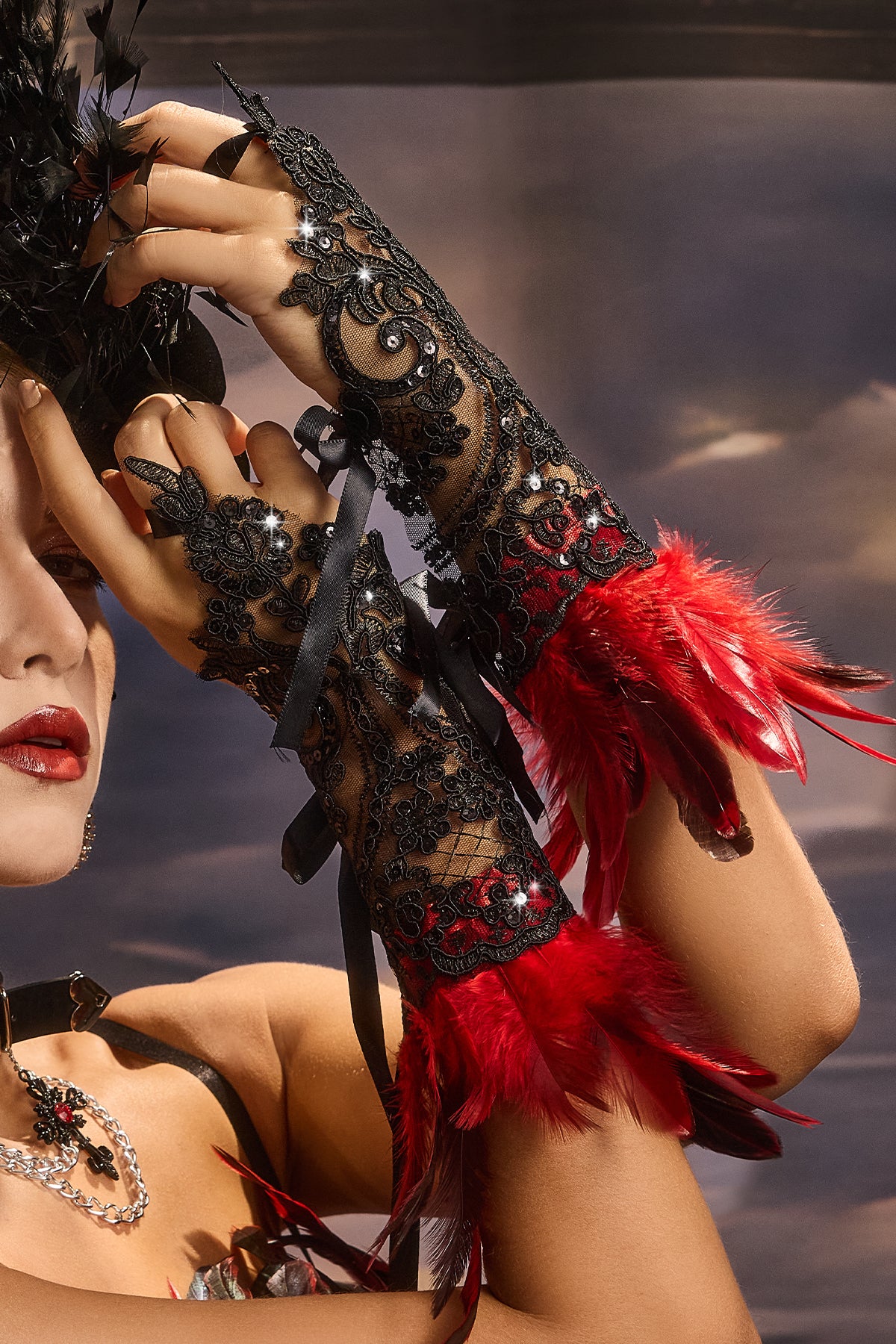 Amyra Feather Lace Gloves Red
