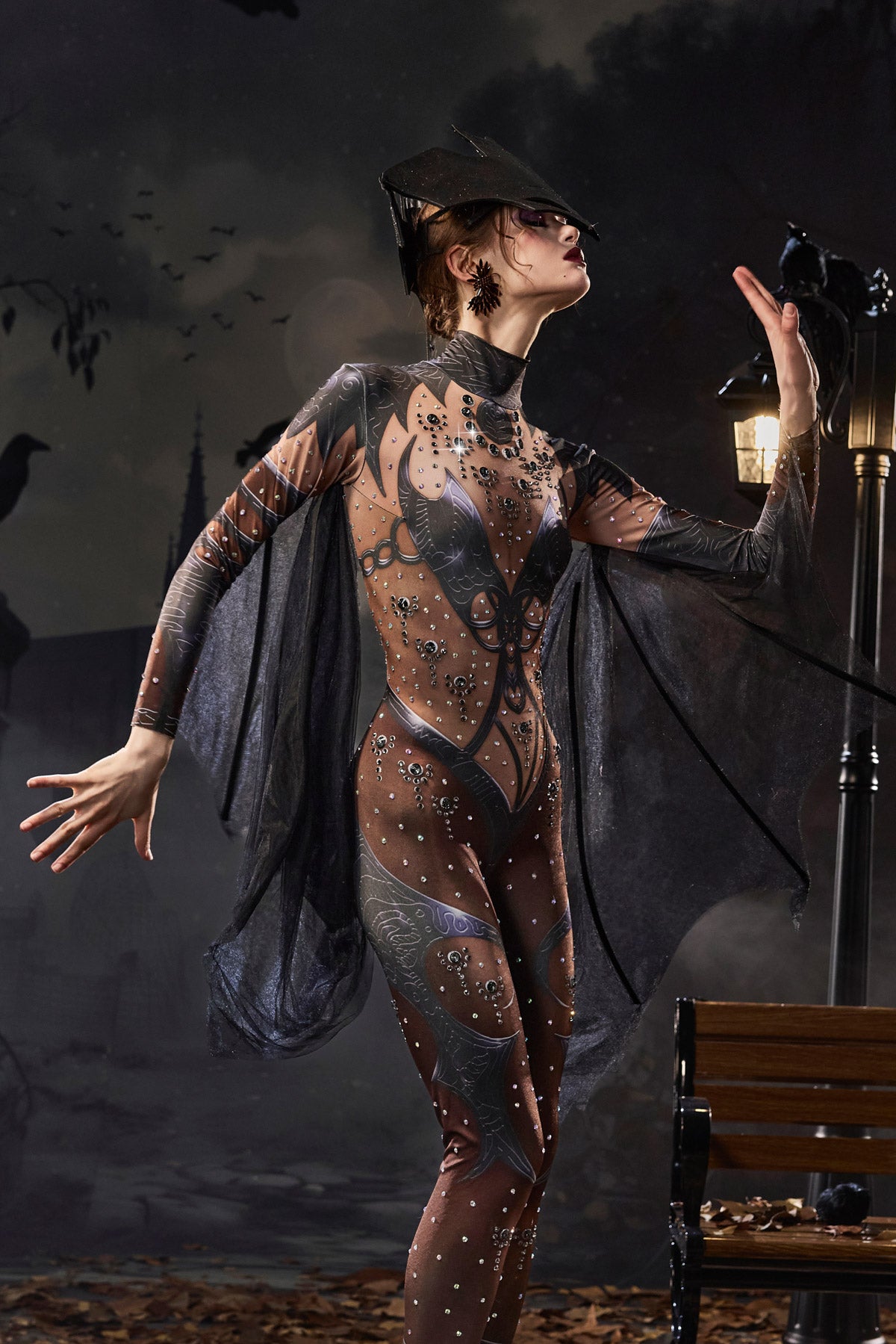Conquer the stage with the Brandon Spooky Night Outfit. This spooky two-piece outfit is designed for performers seeking a darkly alluring aesthetic. The fitted jumpsuit features distinctive batwing extensions on the sleeves, creating a bold, eerie silhouette that expands with every movement. Paired with a matching mask, this outfit exudes mystery and awe, perfect for Halloween, stage performances, and nightclubs. The lightweight stretch design ensures comfort while creating a striking visual impact.