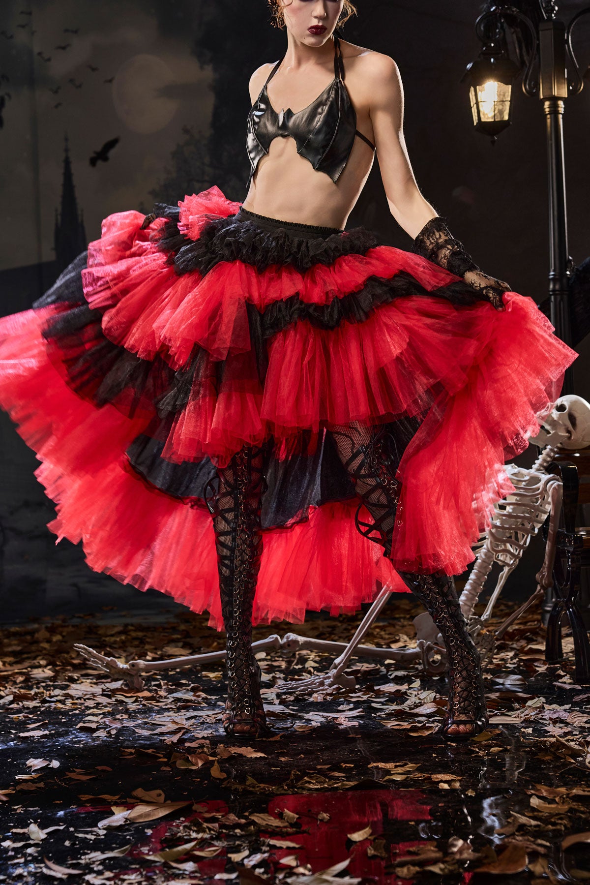 The Louis Asymmetrical Tulle Skirt exudes bold elegance. Featuring a striking black and red ensemble, this skirt features cascading tulle layers and an irregular hem for ultimate drama. The fluid silhouette captures movement and depth, making it ideal for stage performances, gothic evenings, or Halloween. Pair it with a bustier, bodysuit, or silhouetted top for a look that exudes mysterious allure.
