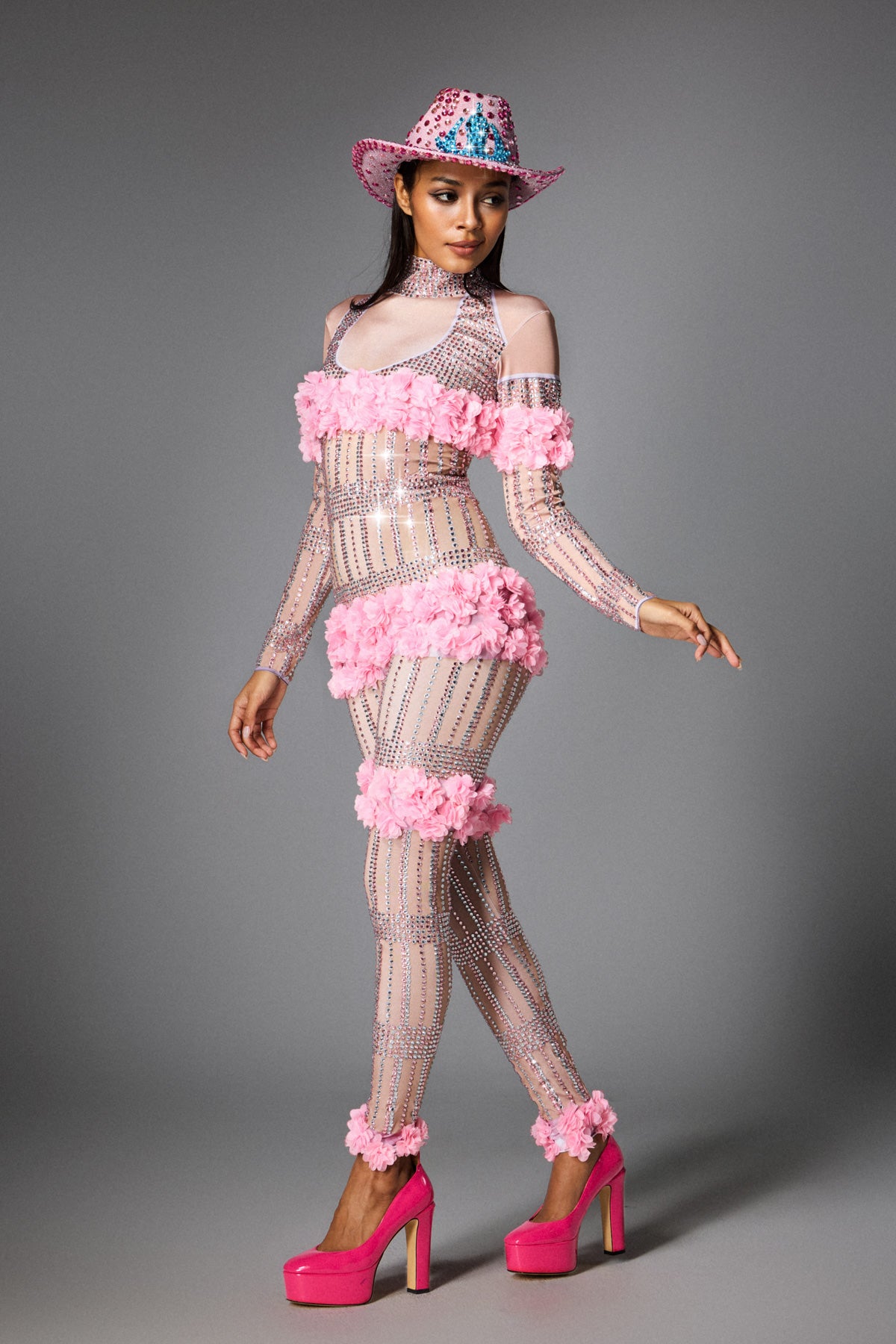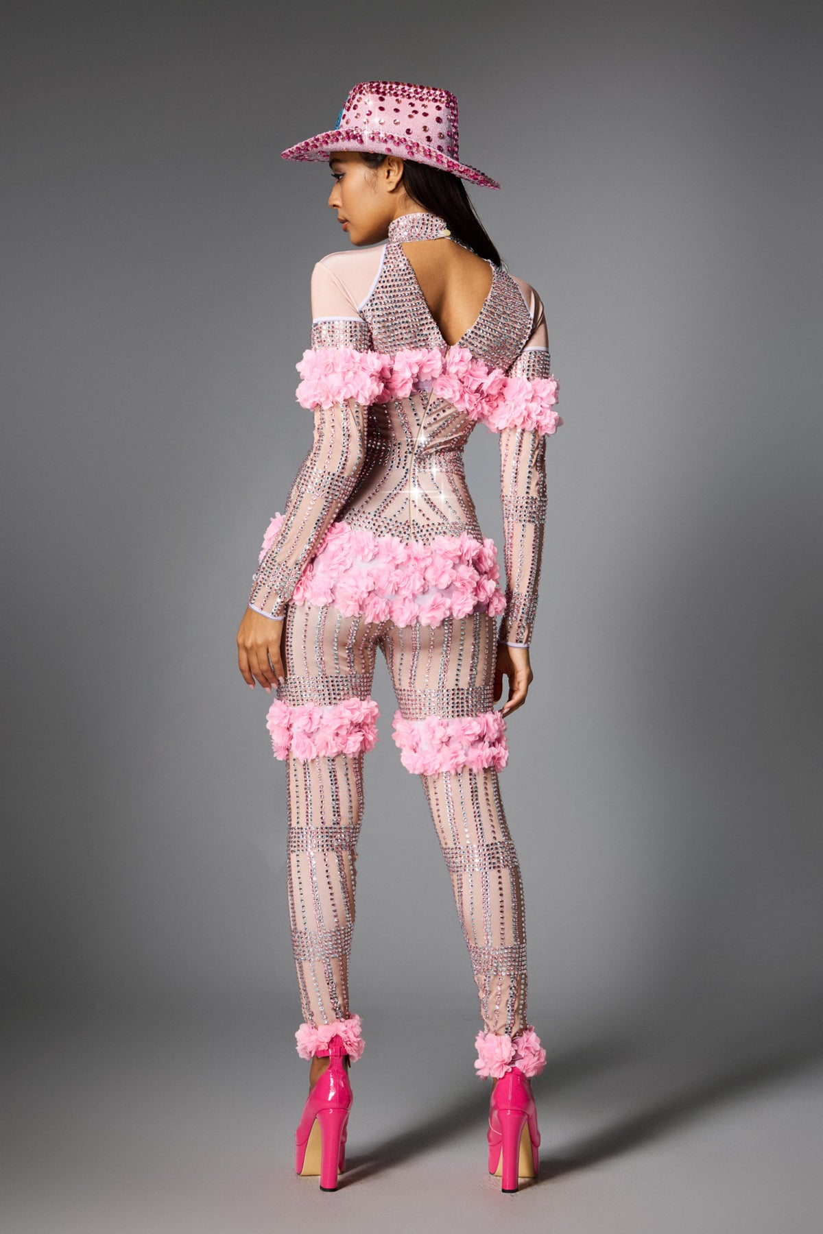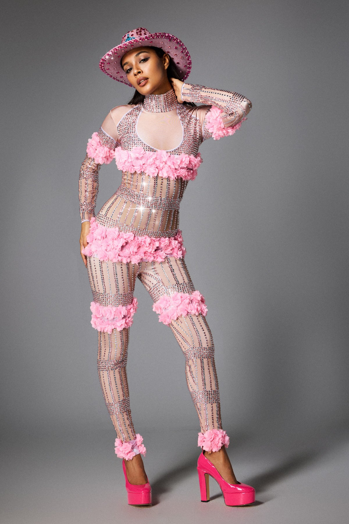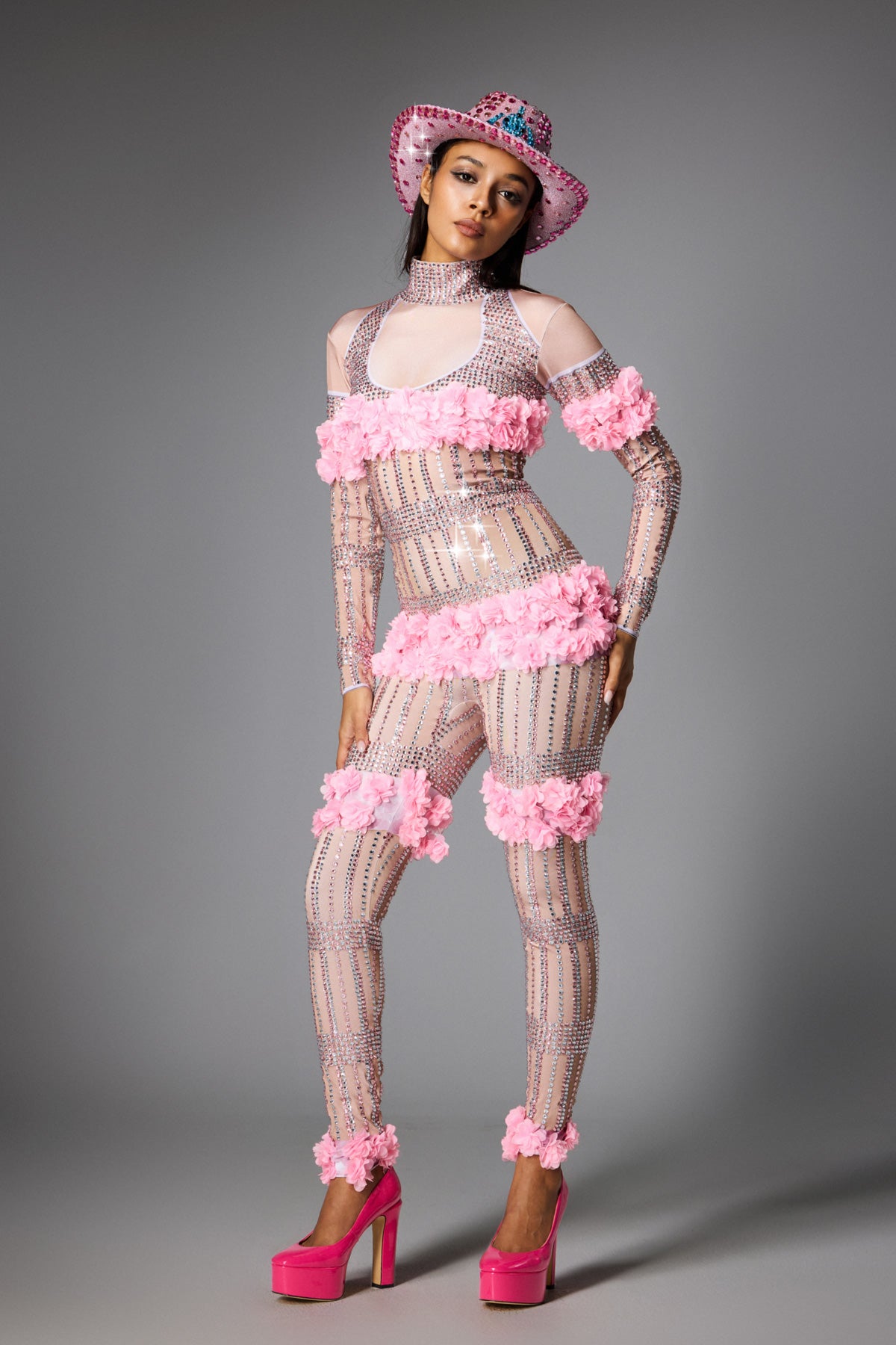 This Melanie Long Sleeve Flower Jumpsuit is a luxurious item designed for stage performances, parties and fashion events. Made of high-quality fabrics, it fits the skin lightly. Decorated with three-dimensional pink flowers and decorated with dazzling rhinestones, it reflects charming light under the light, making you stand out from the crowd.
