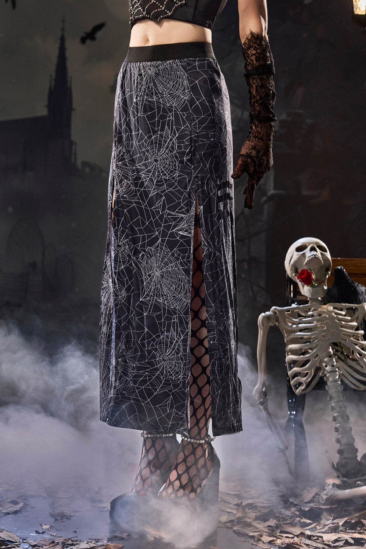 Embrace the mystical, gothic charm of the Tristan Cobweb Printed Skirt. Embellished with a striking spiderweb print, this skirt features a fluid silhouette and a high slit for dramatic effect and movement. Perfect for performances, nightclubs, or Halloween, it blends dark elegance with bold allure, adding the finishing touch to any look.