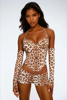 The Drinna Earth Tone Leopard Outfit delivers a confident, nature-driven stage silhouette through its halter-neck leopard printed top, coordinated shorts, and detachable sleeves that balance raw energy with refined control. The halter neckline frames the shoulders and collarbone, opening the upper body for expressive movement while anchoring the look with a strong central line. Earth-toned leopard print wraps the silhouette with organic rhythm, adding depth and visual texture that reads powerfully under stage lighting without overwhelming the form. The fitted shorts ground the outfit with clean lower-body definition, supporting fast footwork and directional shifts, while the separate sleeves extend arm lines and introduce layered motion that enhances gesture clarity. The three-piece construction allows each element to contribute to the overall flow, creating a cohesive yet dynamic performance profile.