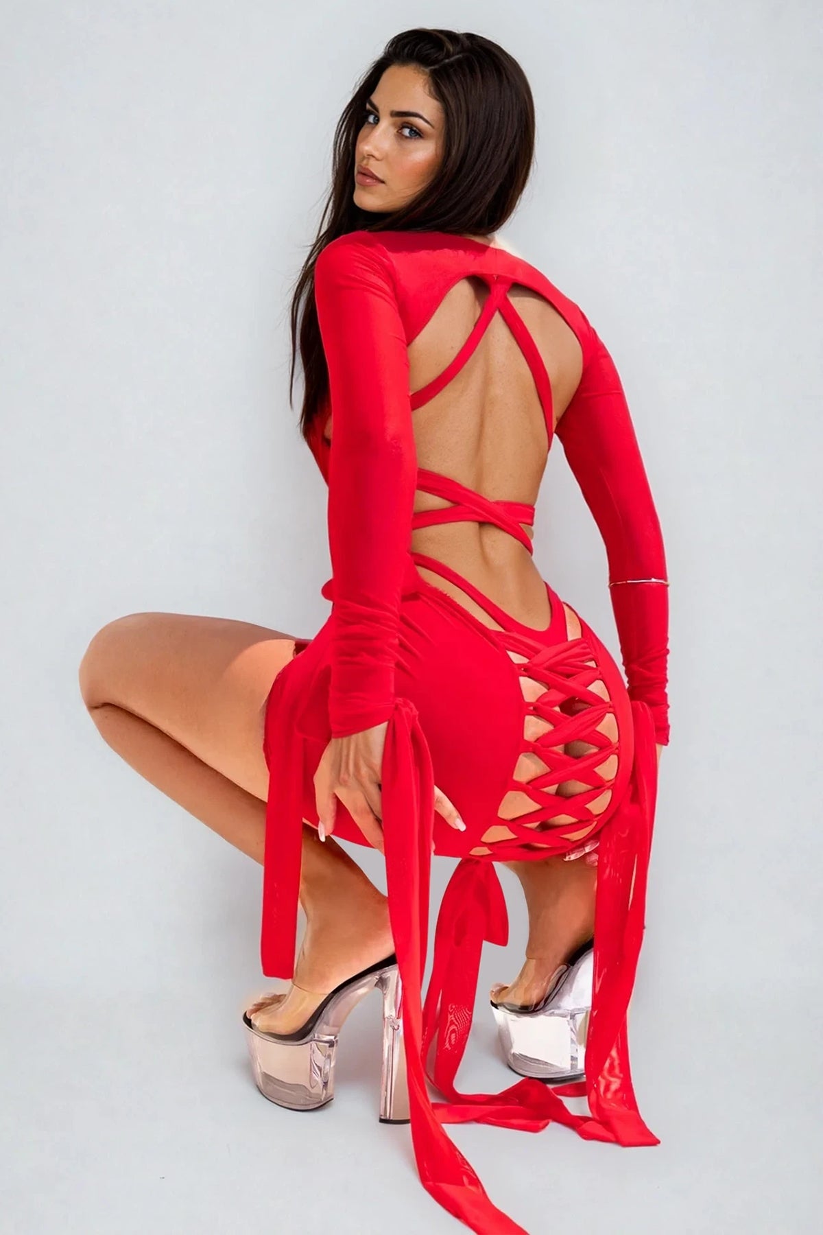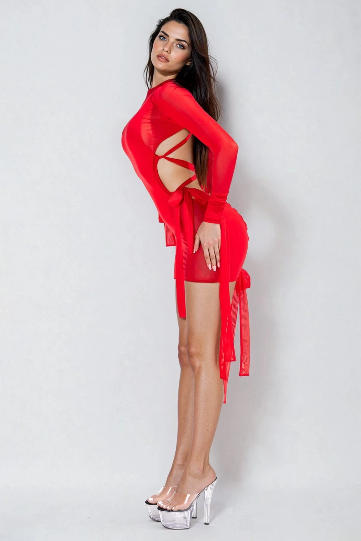 The Eirnys Sculpted Swim Outfit Red delivers a bold, high-impact stage silhouette through its sculpted mesh one-piece swim base paired with a flowing dress overlay that balances structure and fluidity with striking clarity. The fitted mesh bodysuit forms a clean, contoured foundation that defines the body with precision, while sheer mesh elements introduce depth and controlled transparency under lighting. The lightweight dress layer drapes over the form, extending movement into soft, continuous motion that responds elegantly to steps and turns. The vivid red tone amplifies visual intensity, ensuring strong presence and heat-driven energy across the stage without sacrificing refinement.