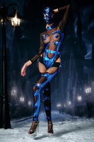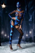 The Fanni Reflective Cobalt Blue Stage Costume blends futuristic style with bold stage presence. This dynamic set includes a bodysuit, matching belt, shaping leg warmers, and a matching mask – all crafted from reflective cobalt blue fabric that shimmers with every movement. The crisp cut accentuates a powerful silhouette, while the reflective fabric adds dramatic tension, making it ideal for high-energy performances, stage shows, or fashion events.
