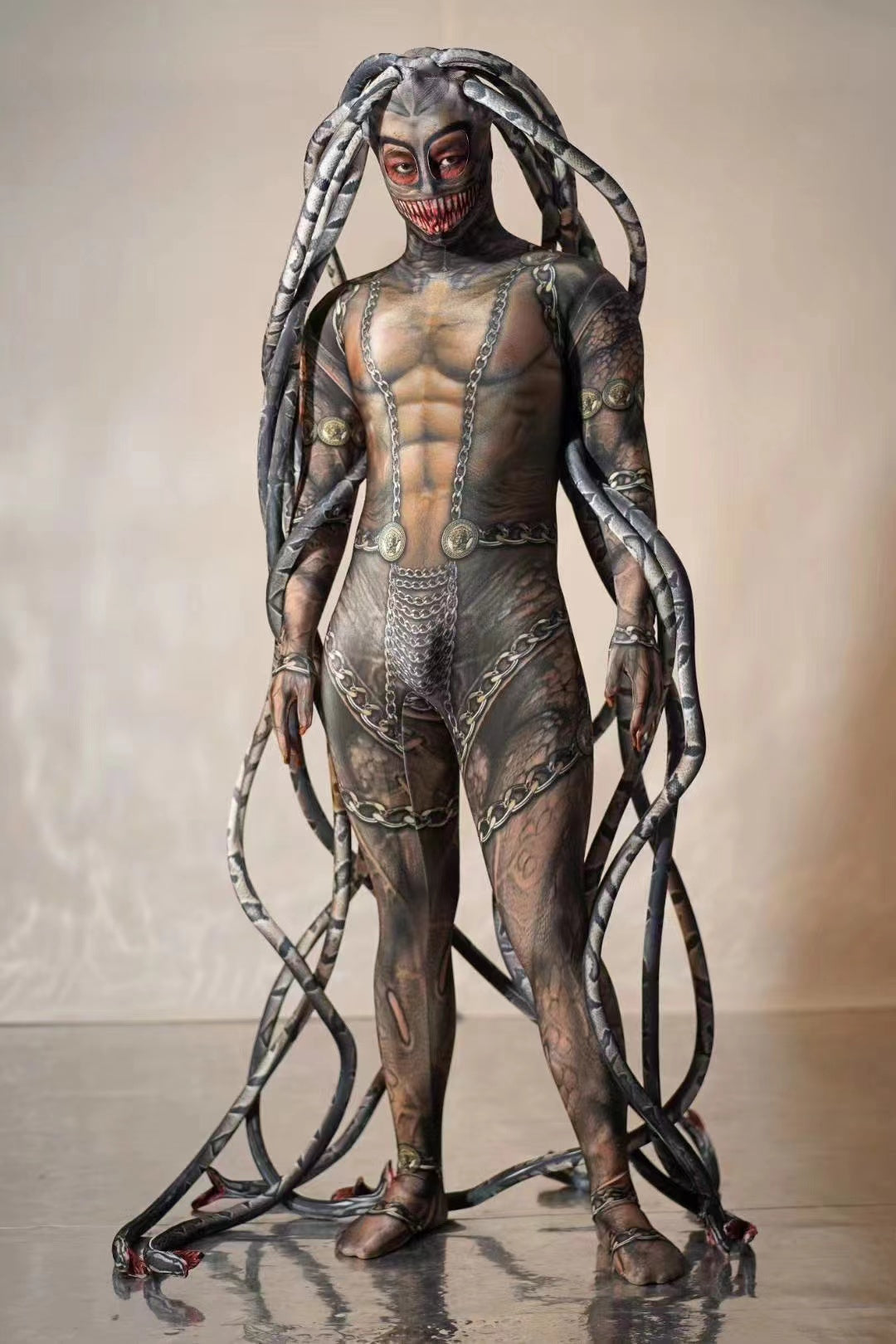 Step into the world of myth and transform into a modern-day Gorgon in this stunning Braelynn Medusa Snake Print Jumpsuit. Designed for stage presence and mythical allure, this jumpsuit features a detailed muscle print, illusion chain elements, and signature snake-like tentacles extending from the head and limbs. The all-over design flatters your curves while maintaining flexibility for performance or dance. Whether you're wowing the crowd at a concert, Halloween event, or Cosplay convention, this jumpsuit will wow everyone who sees you.