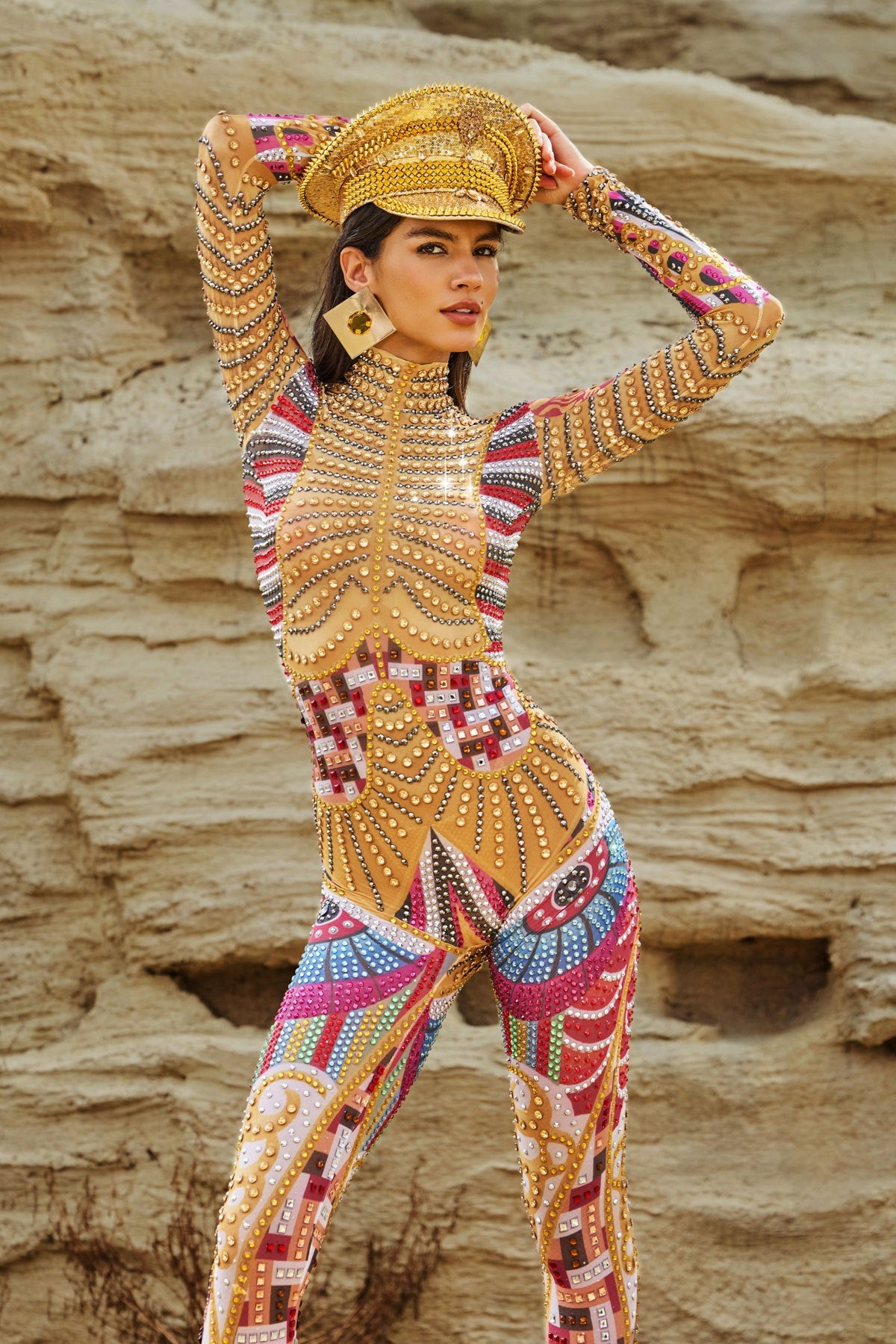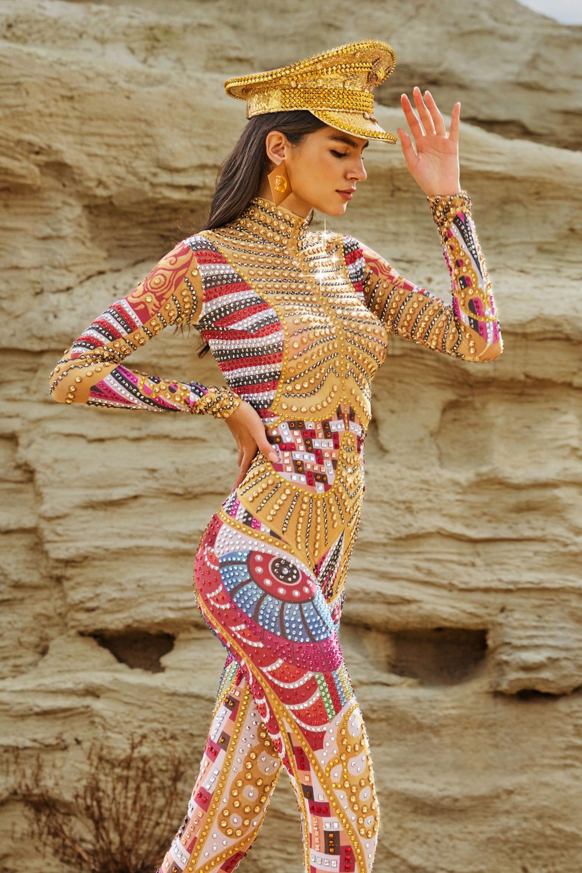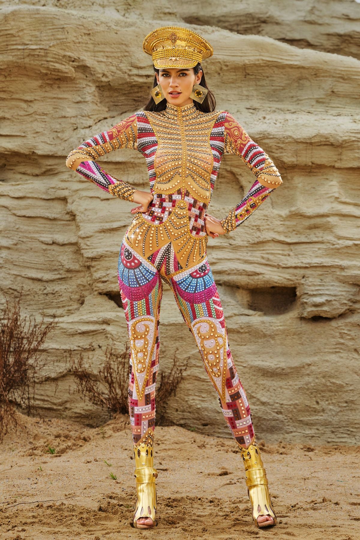 Take your performance to the next level with the Diego Long Sleeve Printed Embellished Jumpsuit. This stunning long-sleeved jumpsuit combines a vibrant print with dazzling rhinestone embellishments. This bodycon jumpsuit frames your figure and catches every light, making every move sparkle. Made from stretch fabric for ultimate comfort and mobility, it's perfect for taking charge on stage, slaying on the dance floor, or making an unforgettable statement at any event