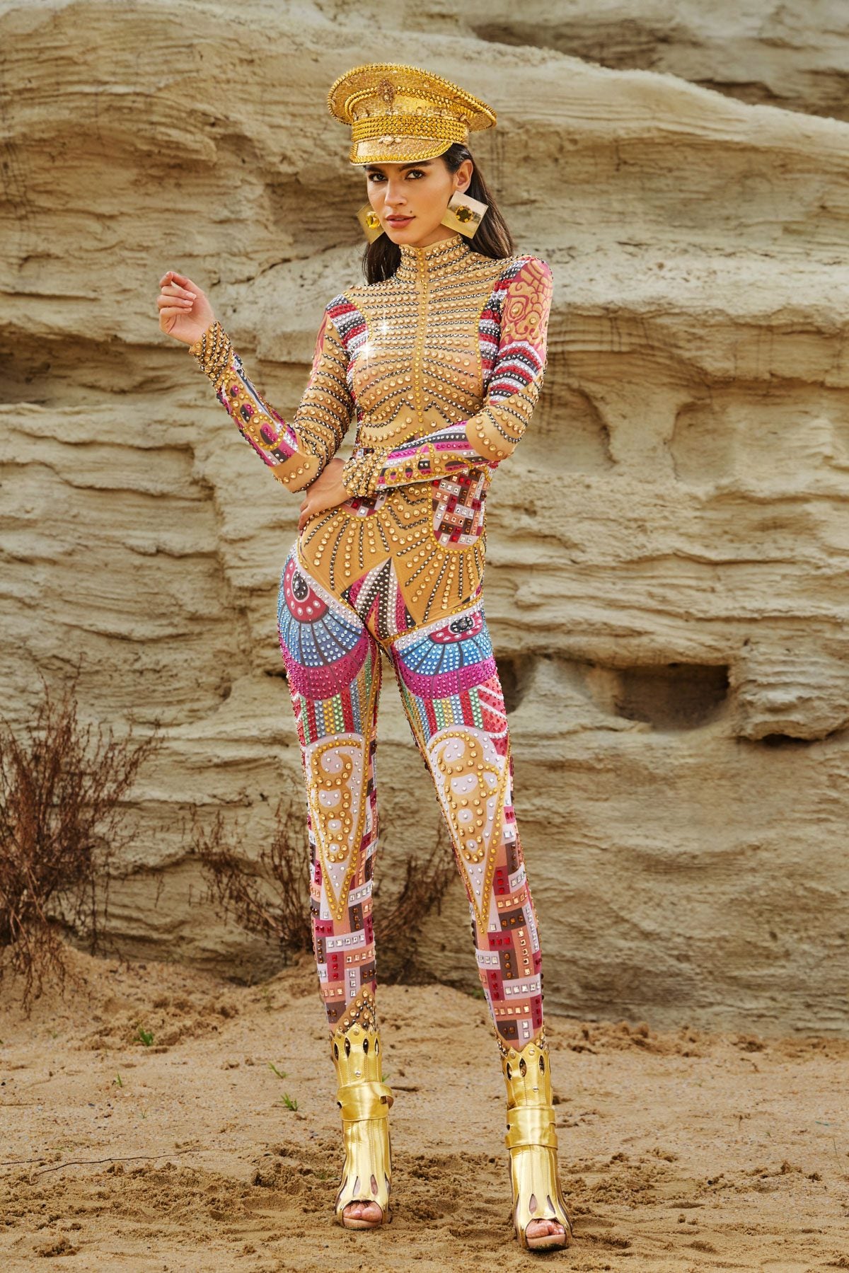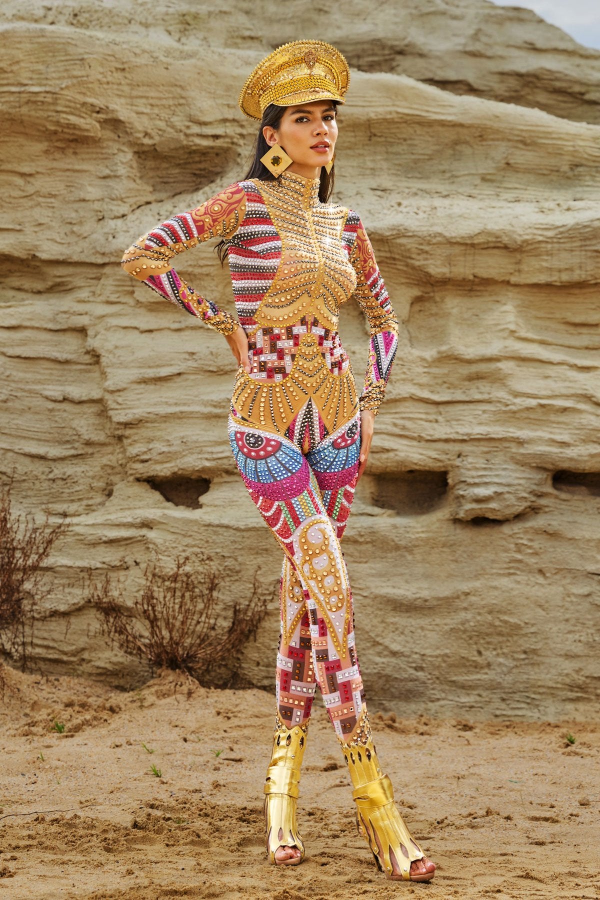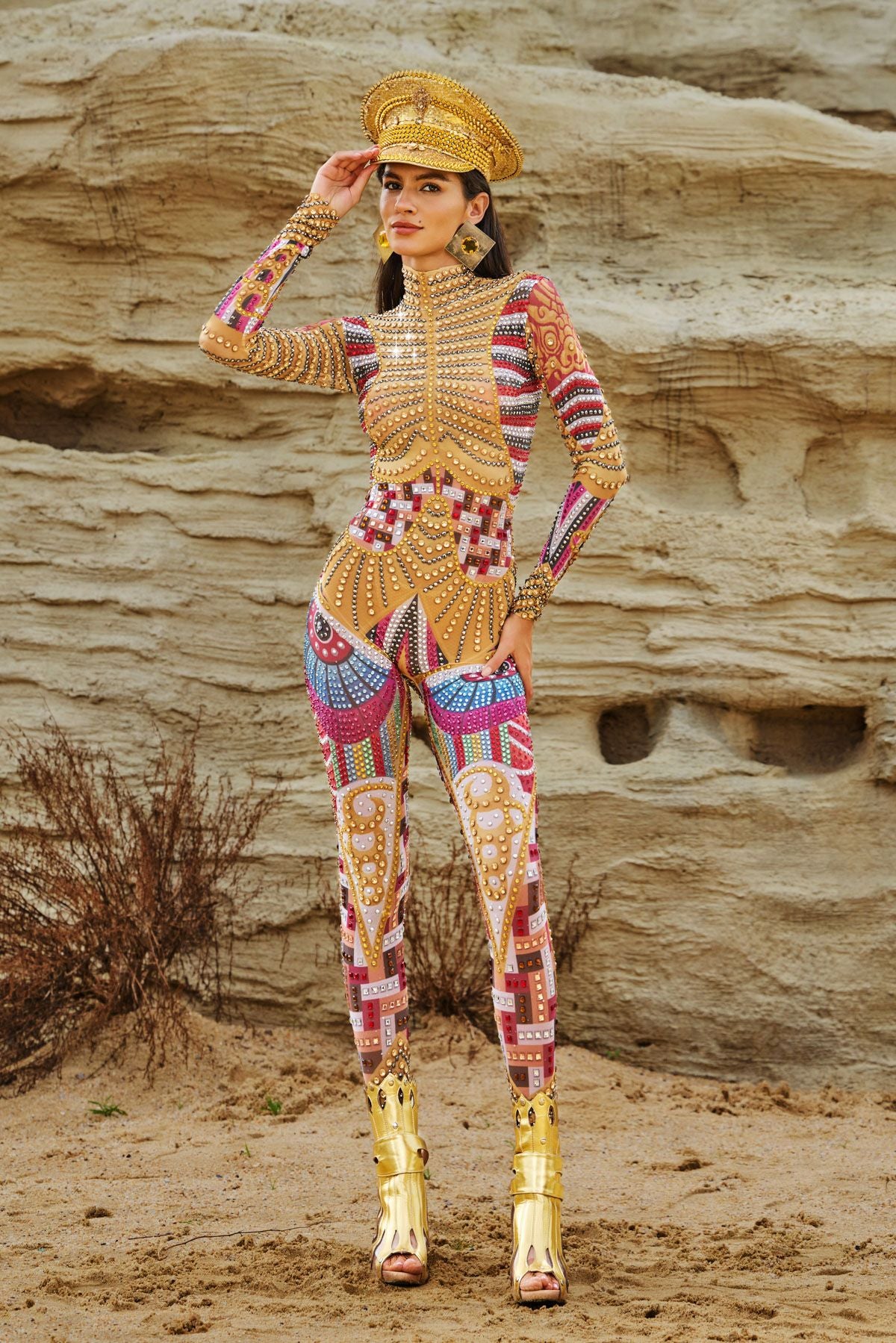 Take your performance to the next level with the Diego Long Sleeve Printed Embellished Jumpsuit. This stunning long-sleeved jumpsuit combines a vibrant print with dazzling rhinestone embellishments. This bodycon jumpsuit frames your figure and catches every light, making every move sparkle. Made from stretch fabric for ultimate comfort and mobility, it's perfect for taking charge on stage, slaying on the dance floor, or making an unforgettable statement at any event