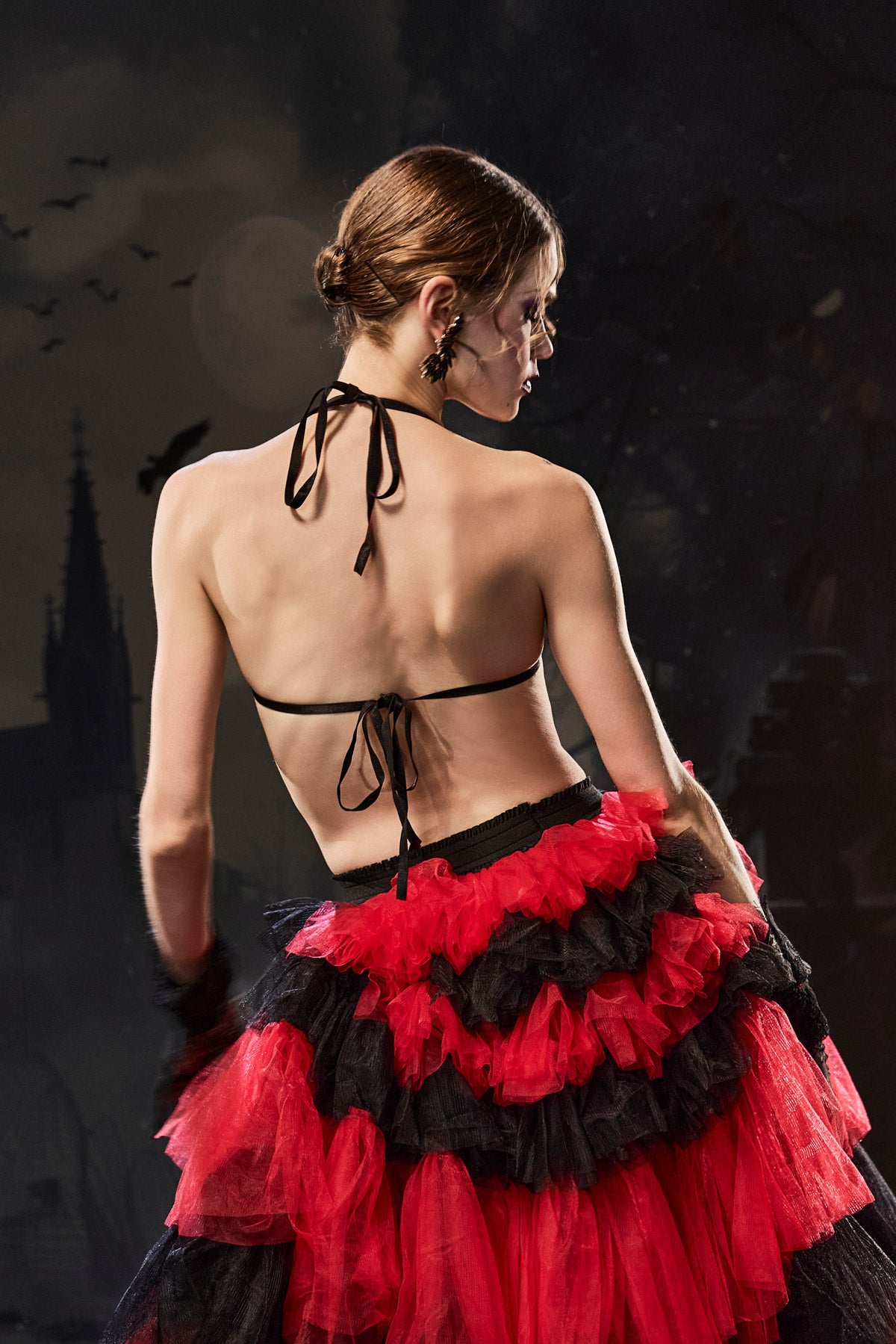 The lsmael Bat Halter Neck Top exudes nocturnal elegance. Crafted from deep black fabric, this top features a dramatic halter neckline and batwing details, adding a bold, gothic edge. The sleek silhouette accentuates shoulders while maintaining a mysterious feel, making it ideal for stage performances, Halloween parties, or any dark fantasy fashion event. Whether worn alone or layered as part of an outfit, this top perfectly balances allure and dramatic flair.