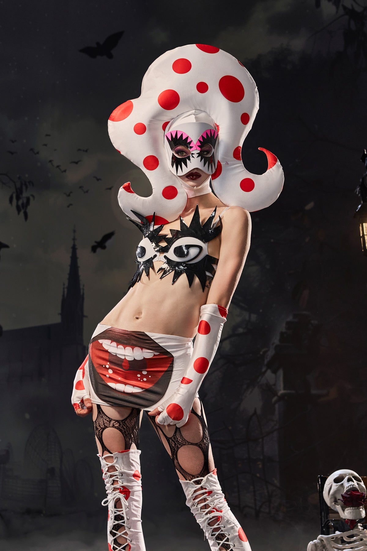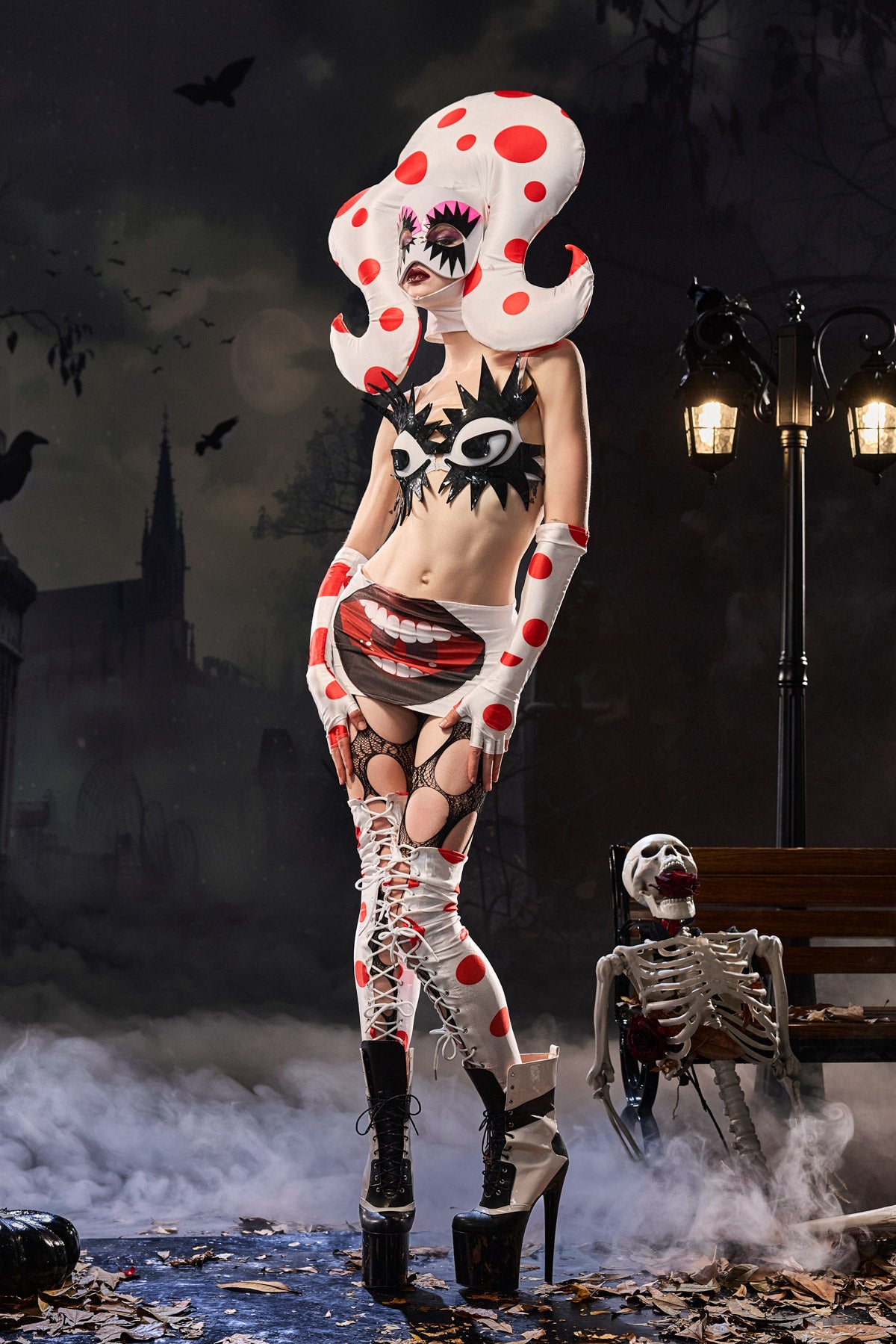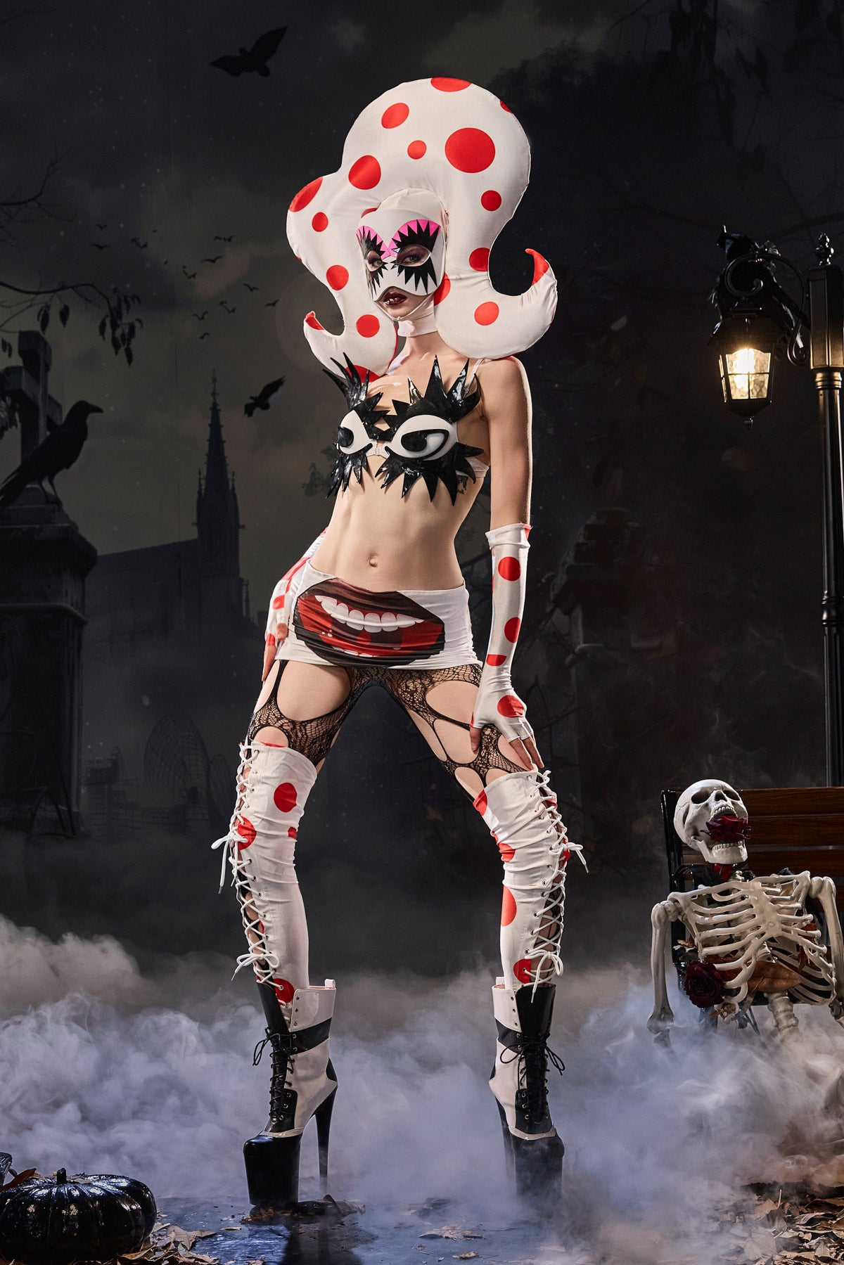 Dive into a magical underwater world with the Martin Polka Dot Octopus Outfit, a playful yet dramatic costume designed for stage and party performances. This complete outfit, with its bold polka dot design and striking tentacle accents, brings ocean fantasy to life. Composed of a supportive bra top and matching waist skirt, paired with stylish leggings, it creates a flattering yet dynamic silhouette. A headpiece and matching mask add a touch of mystery and depth, while gloves and leg warmers transform you into a whimsical marine character. Perfect for carnivals, themed shows, and festivals, this outfit will make you the center of attention with its bold allure and oceanic flair.