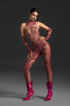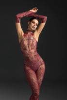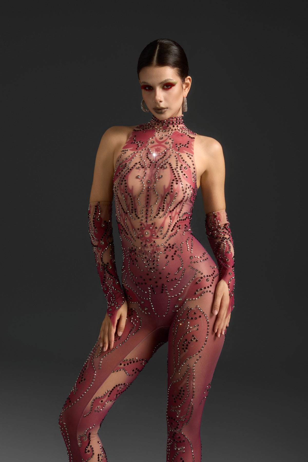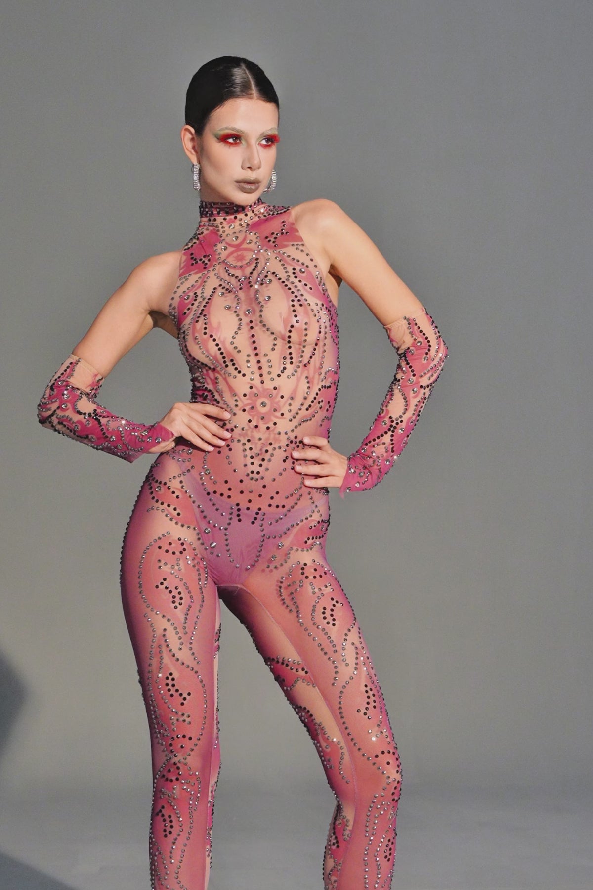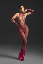 The Nanna Long Sleeve Mesh Rhinestone Jumpsuit redefines stage-ready glamour through its seamless fusion of transparency, structure, and light. Crafted from sheer mesh adorned with intricate rhinestone embellishments, it sculpts the silhouette with sleek precision while radiating confidence in every movement. The long sleeves balance allure with elegance, making it a statement piece for performance, nightlife, or high-fashion moments.