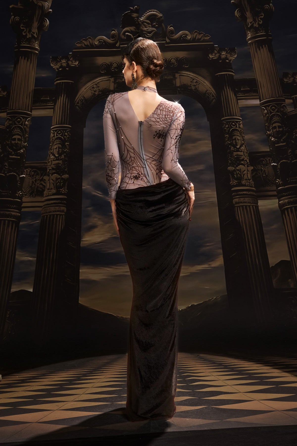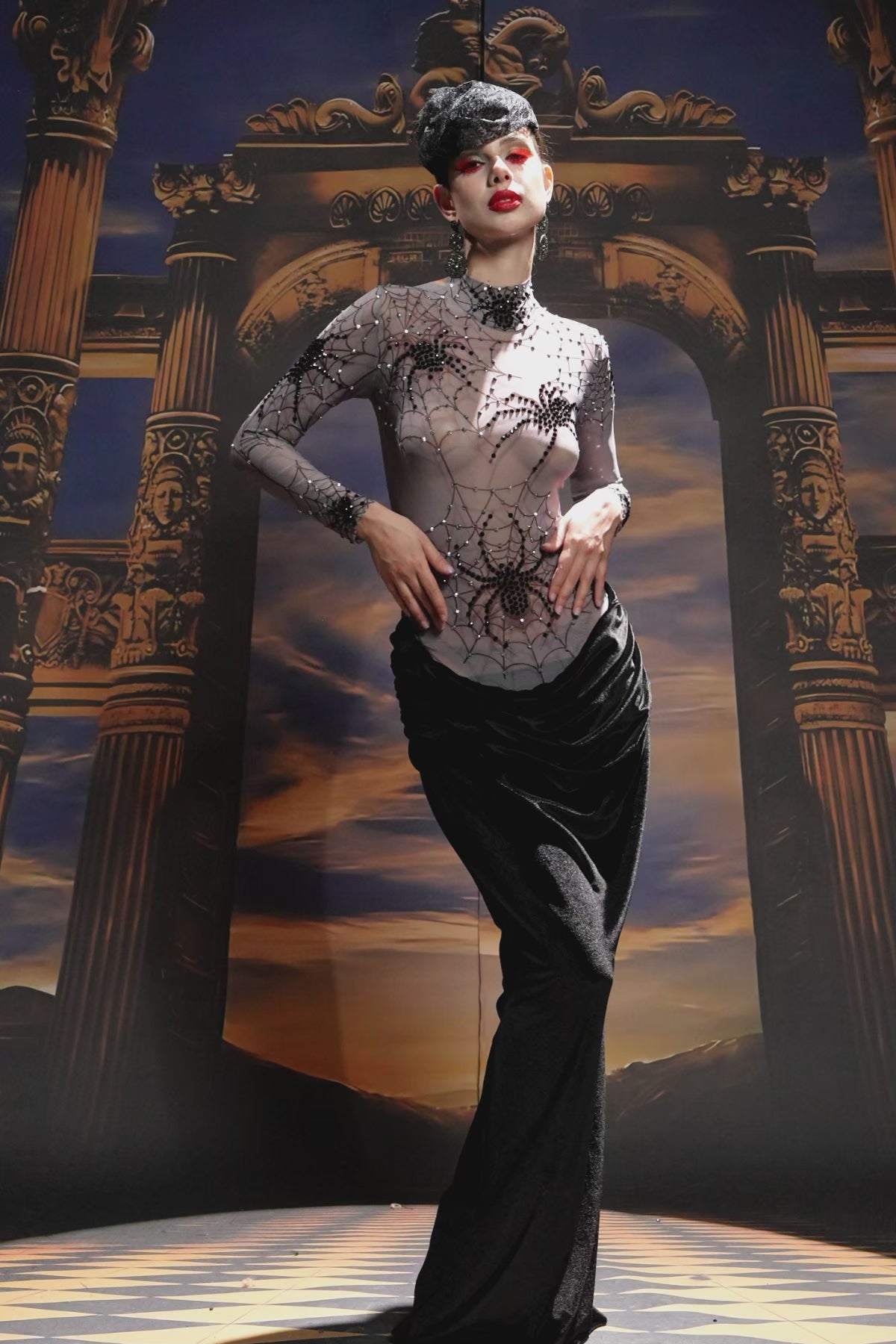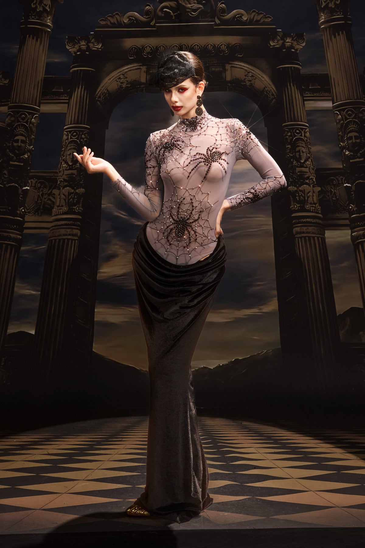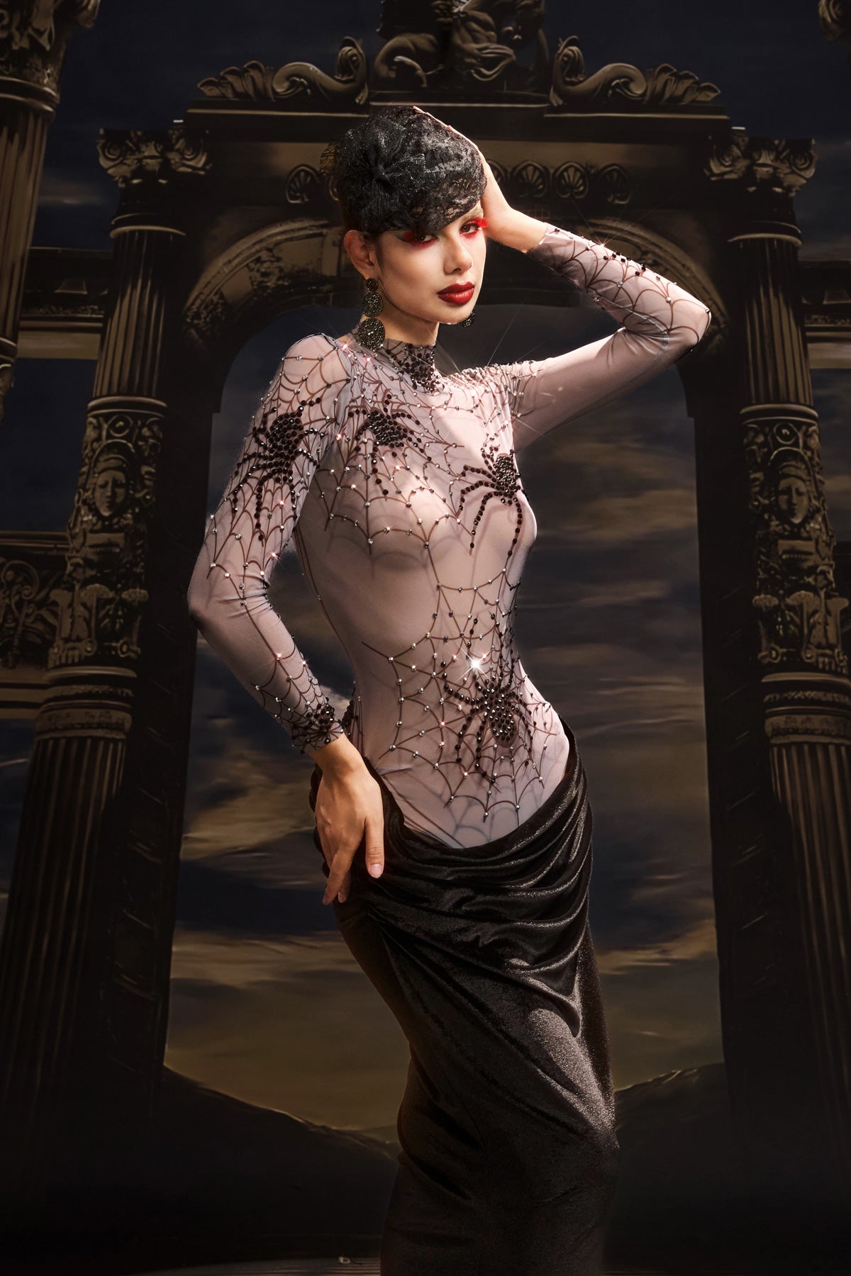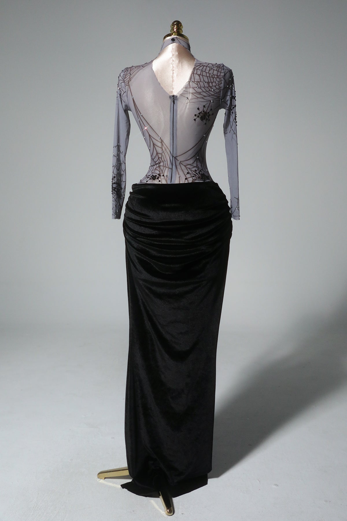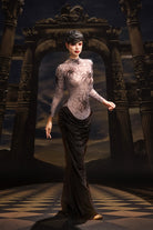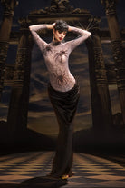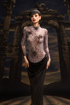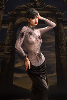 The Rani High Neck Spider Velvet Dress embodies gothic sophistication with a luxurious, tactile edge. Crafted from rich velvet with a subtle spider-inspired pattern, this piece captures both mystery and refinement. The high neckline and fitted silhouette create a sleek, commanding profile, while the velvet’s deep sheen adds dimension and allure. Perfect for stage performances, themed events, or high-fashion showcases, this dress exudes confidence, artistry, and a touch of dark enchantment.