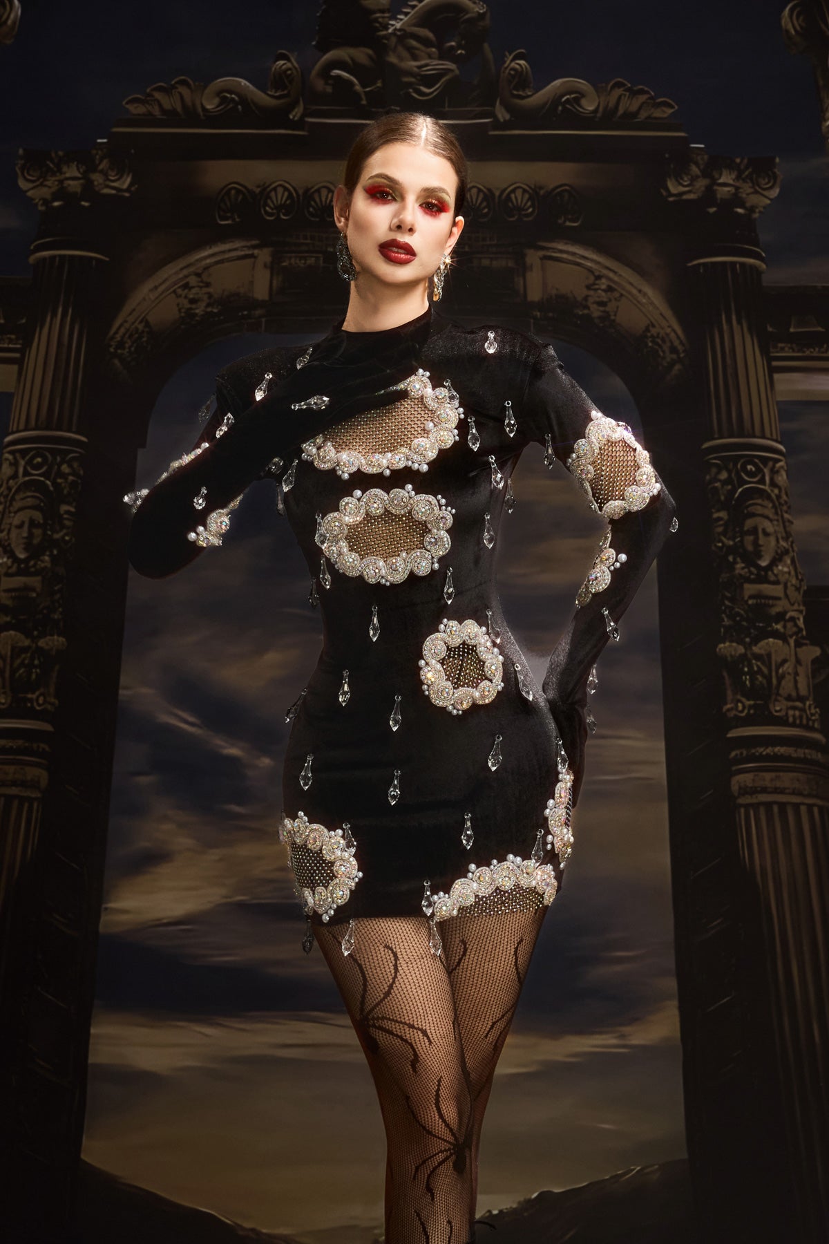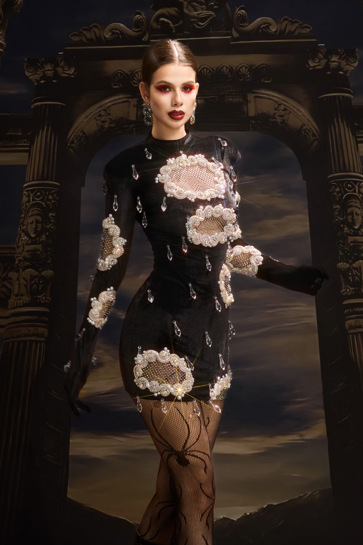 The Taina Cutout Crystal Embellished Mini Dress captures the essence of bold sophistication with its luminous detailing and sleek form. Designed with strategic cutouts and adorned with precision-placed crystals, this dress balances allure and refinement in perfect harmony. The mini length enhances movement and modernity, while the crystal embellishments create a captivating play of light. Perfect for performances, upscale events, or statement evenings, this piece embodies confidence, glamour, and elevated stage appeal.