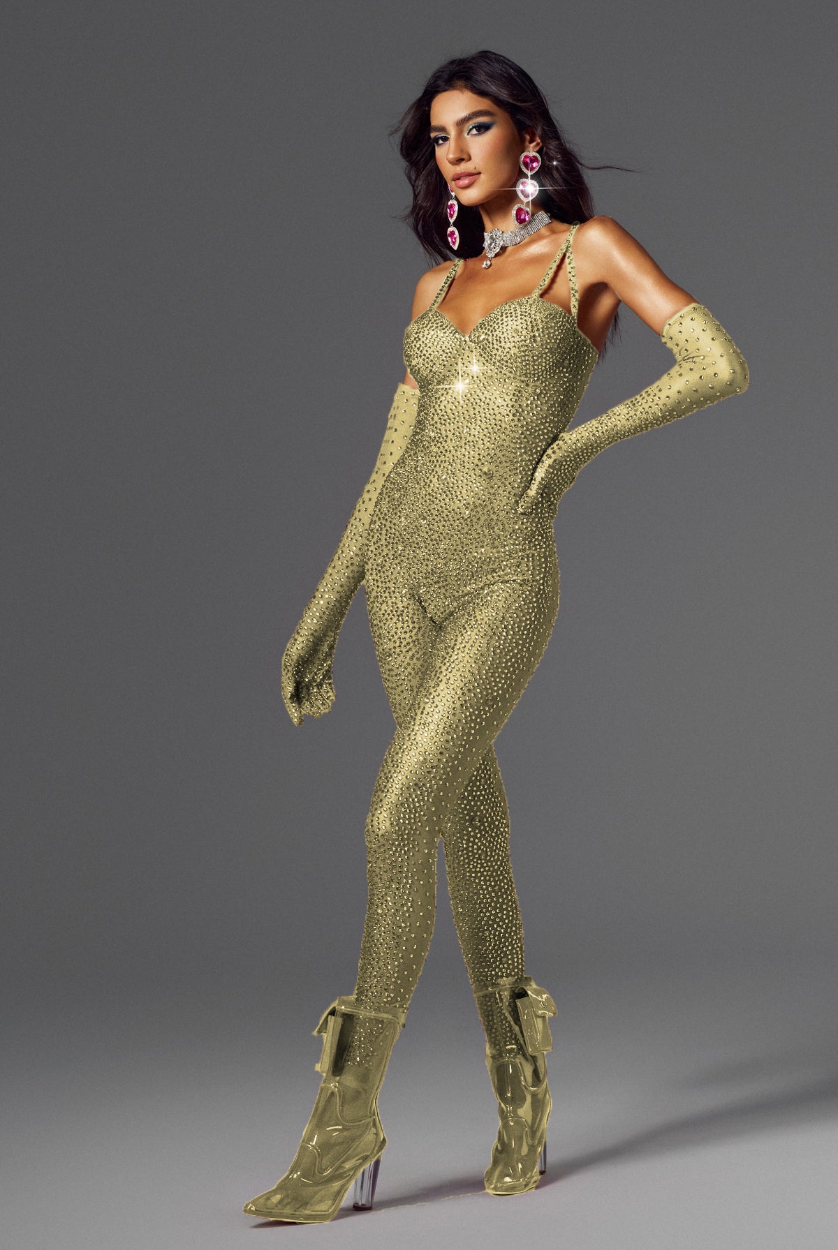 Channel the iconic glam of Dua Lipa’s Future Nostalgia Tour and her newest Radical Optimism visuals with this stage-ready collection of high-octane fashion. Think electric colorways, crystal mesh, body-sculpting cutouts, and latex-slick finishes. Every piece is designed to move, shine, and dominate the dancefloor — just like Dua herself.