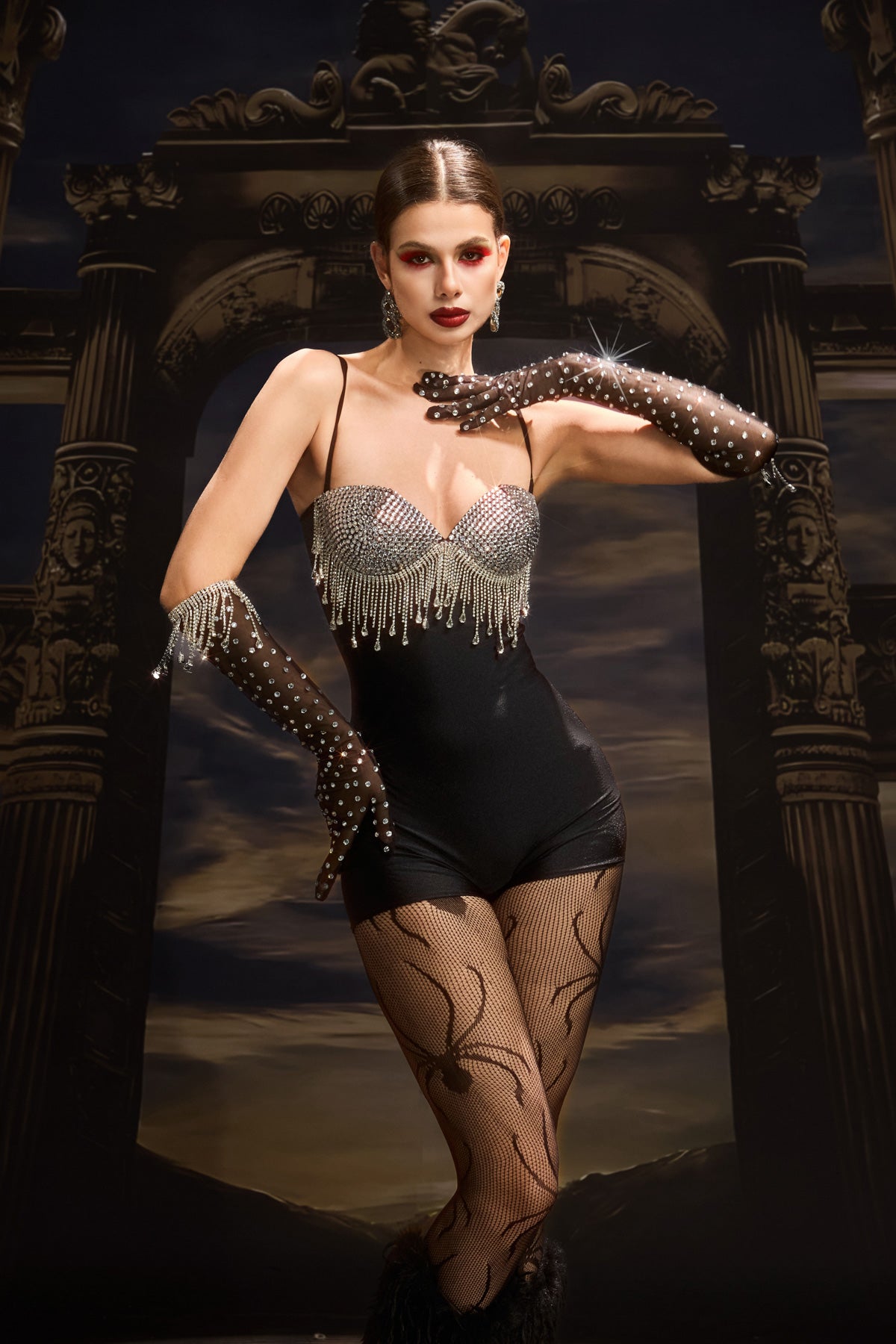 Zinnia Spaghetti Rhinestone Playsuit-Radiant Fluidity in Dazzling Form