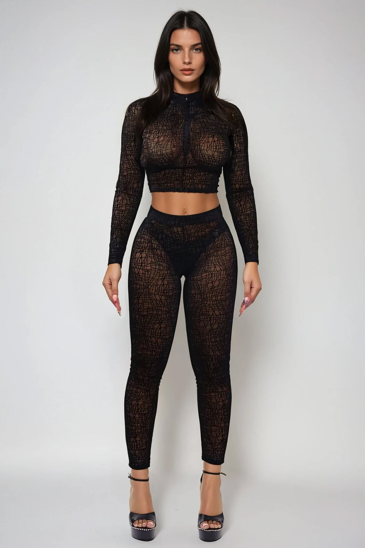 The Aervin Long Sleeve Cobweb Pants Set delivers a bold, high-definition stage silhouette defined by its elongated long-sleeve structure, intricate cobweb-inspired graphic patterning, and coordinated two-piece construction designed for clarity and control in motion. The long sleeves extend the upper-body line with clean symmetry, sharpening gesture visibility and giving arm movements a precise visual frame under lighting. The cobweb motifs spread across the fabric in branching, tensioned lines that echo kinetic energy, creating layered visual depth that activates dynamically with turns and directional shifts. Paired with the matching pants, the set forms a continuous vertical alignment that keeps the silhouette cohesive and uninterrupted from shoulder to hem.