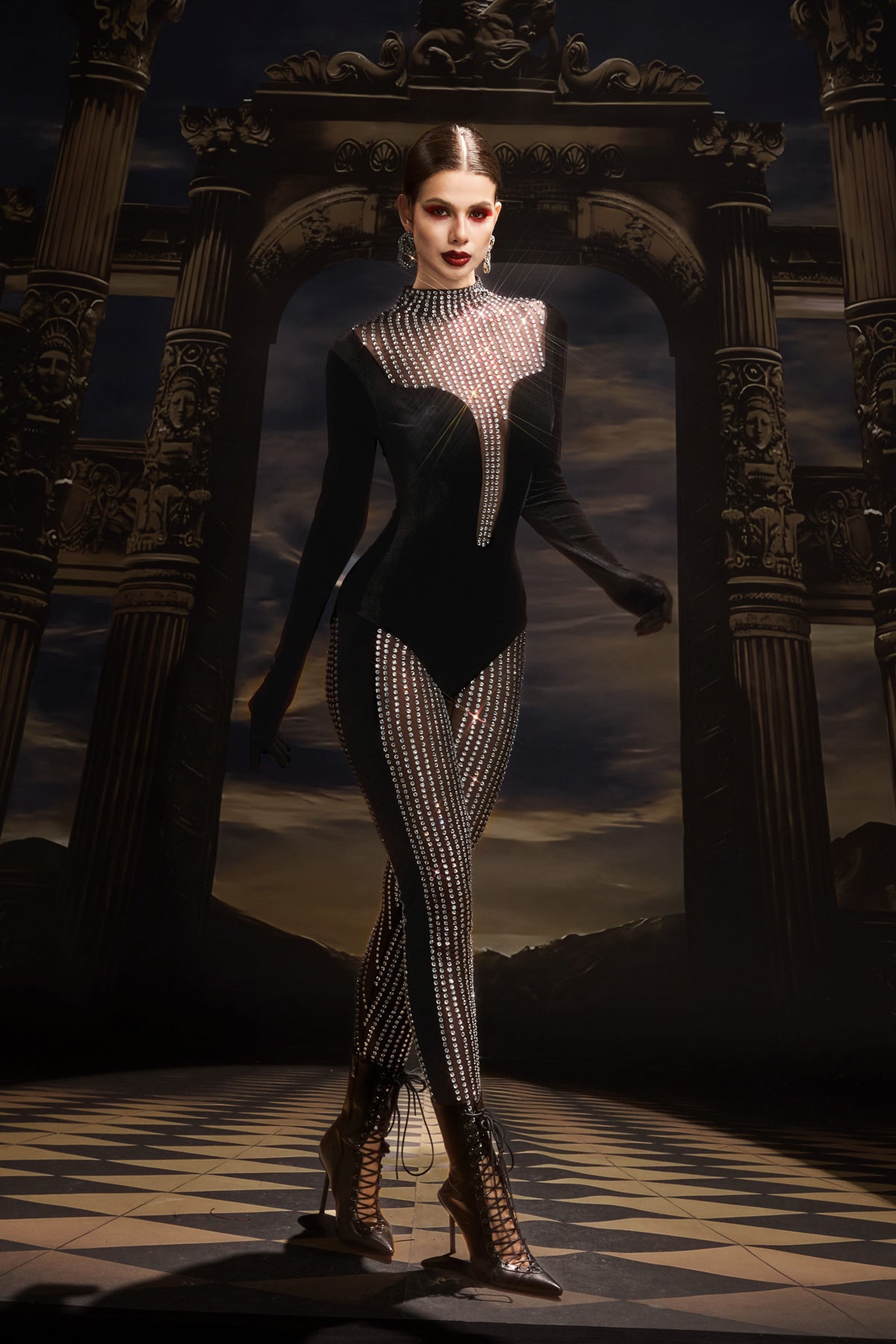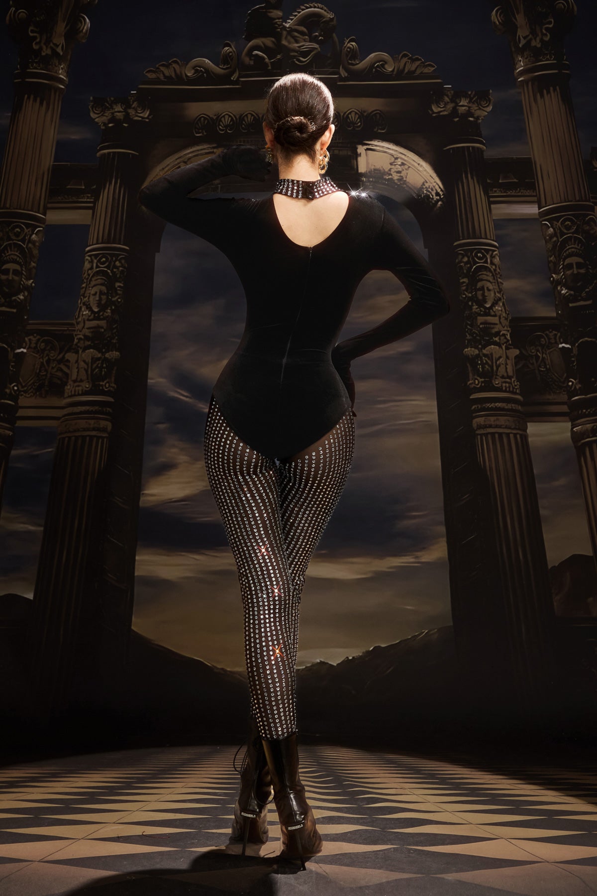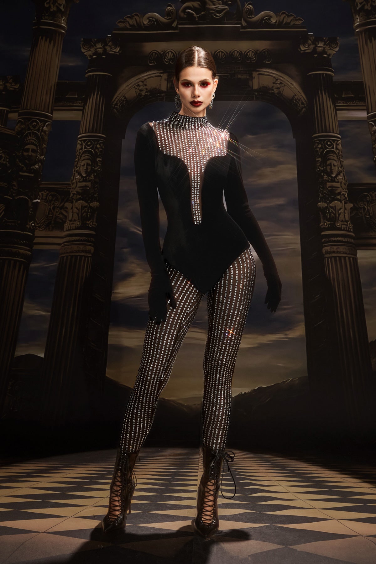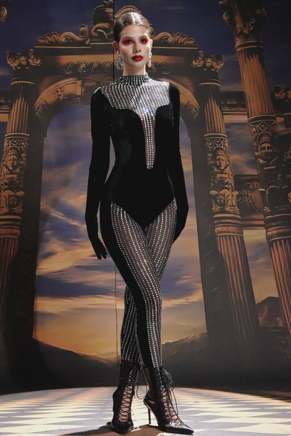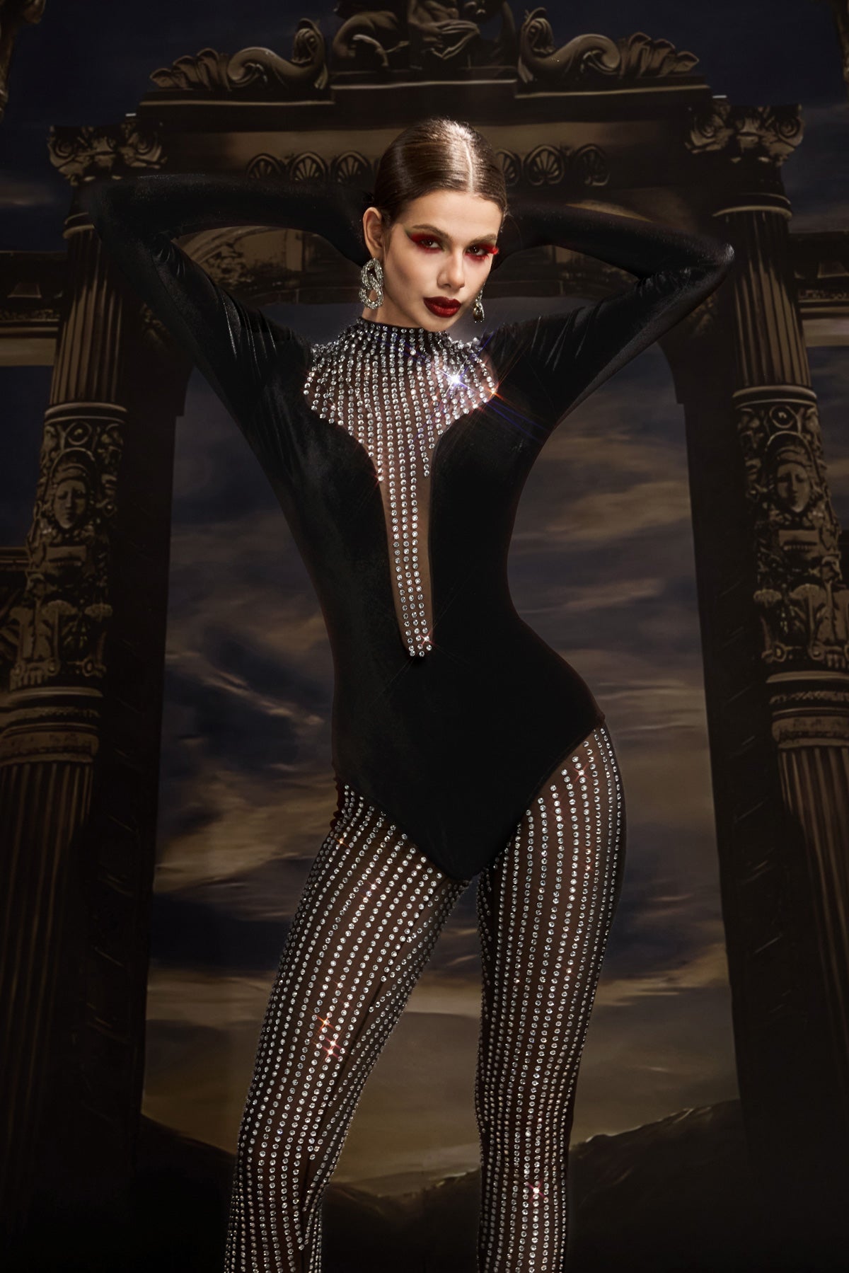 - Two-Piece Design: Includes rhinestone bodysuit and matching pants.