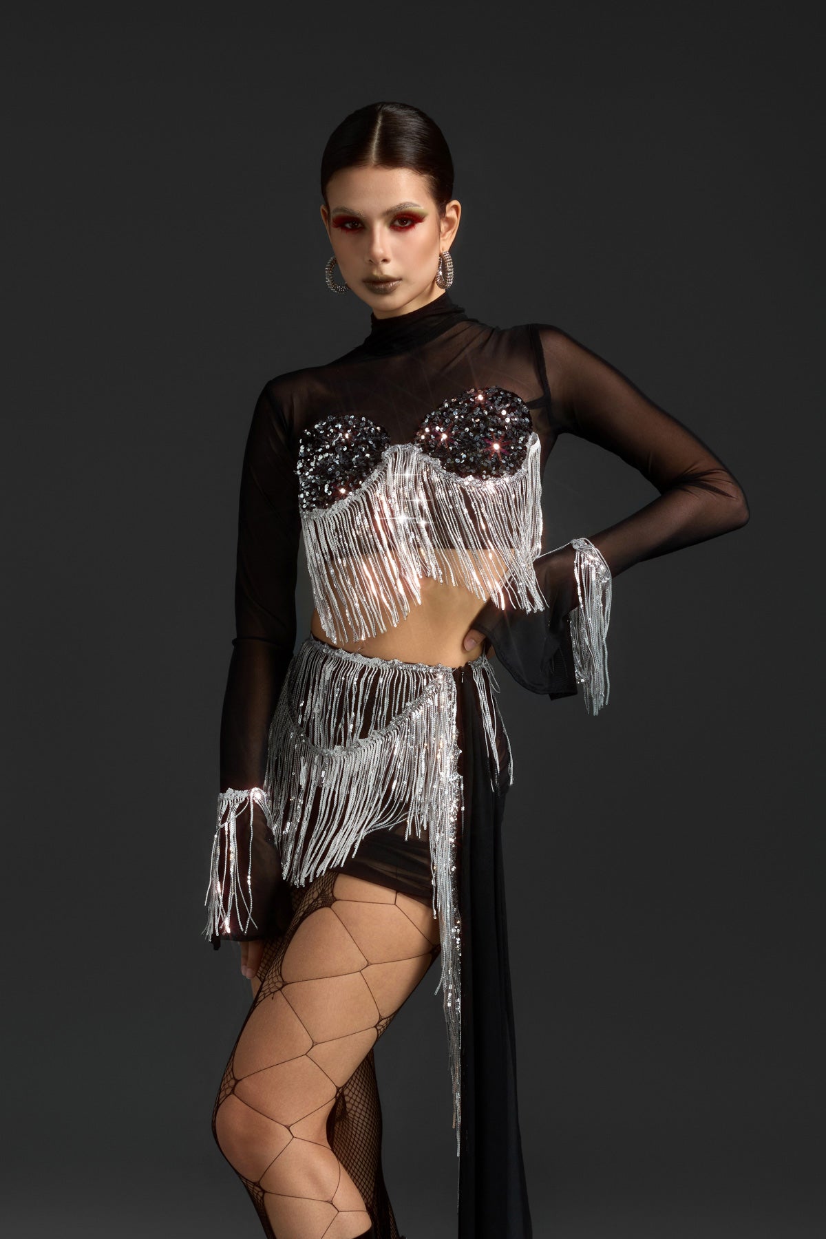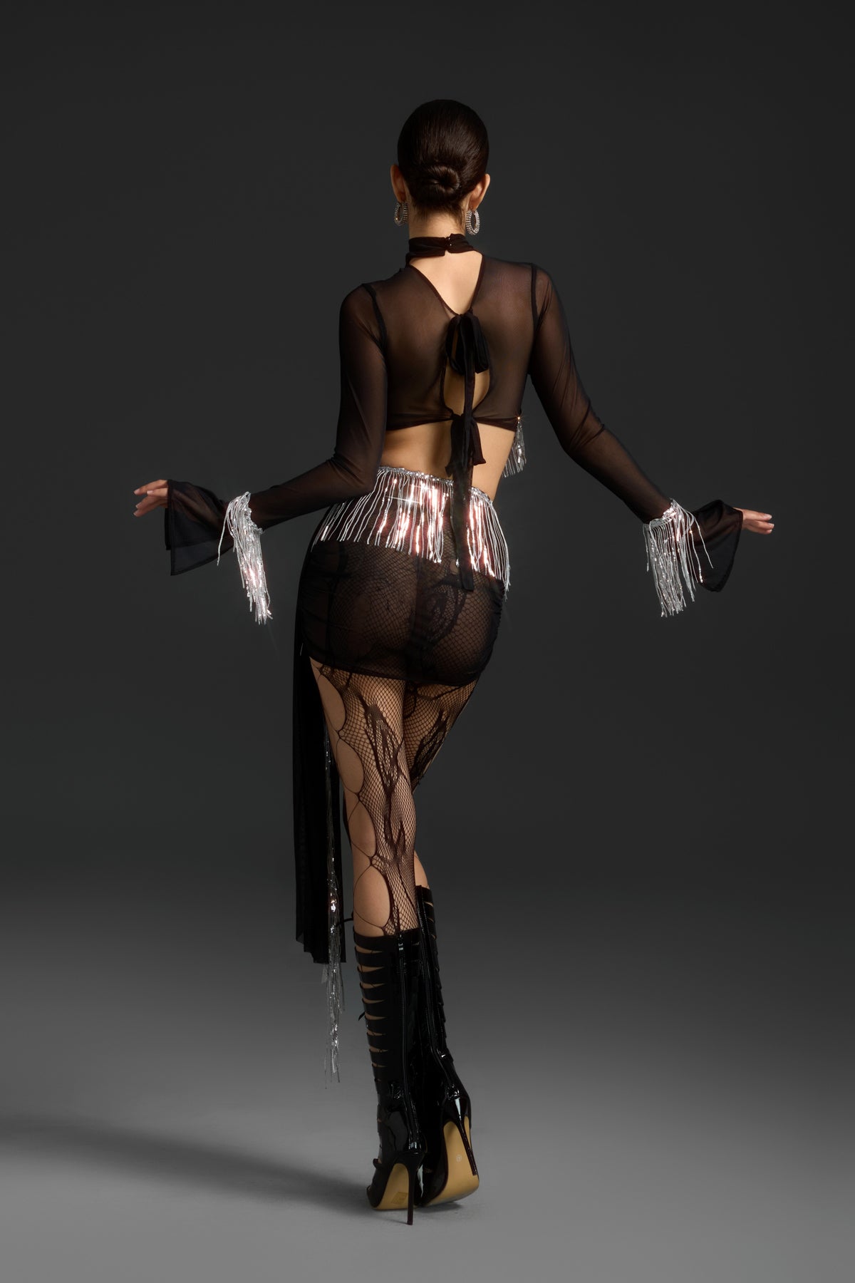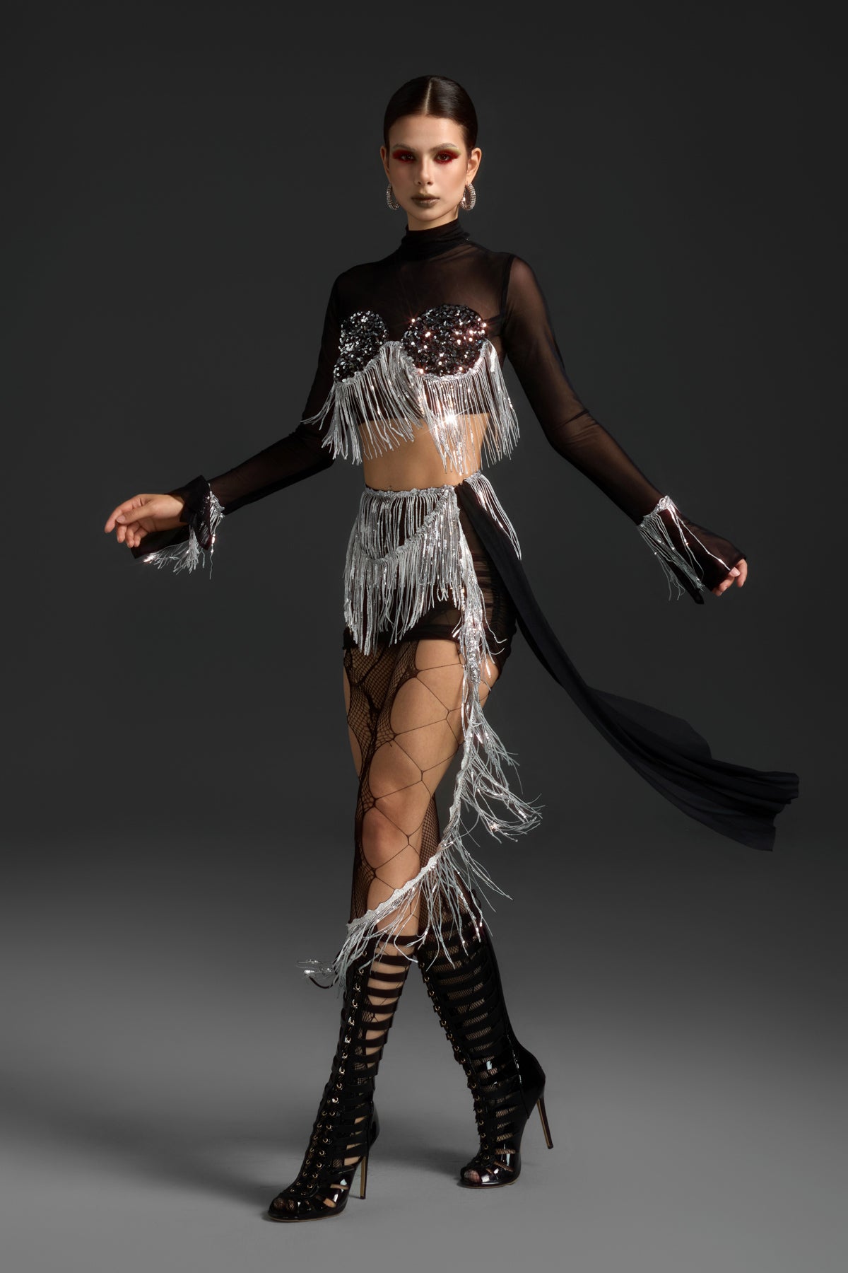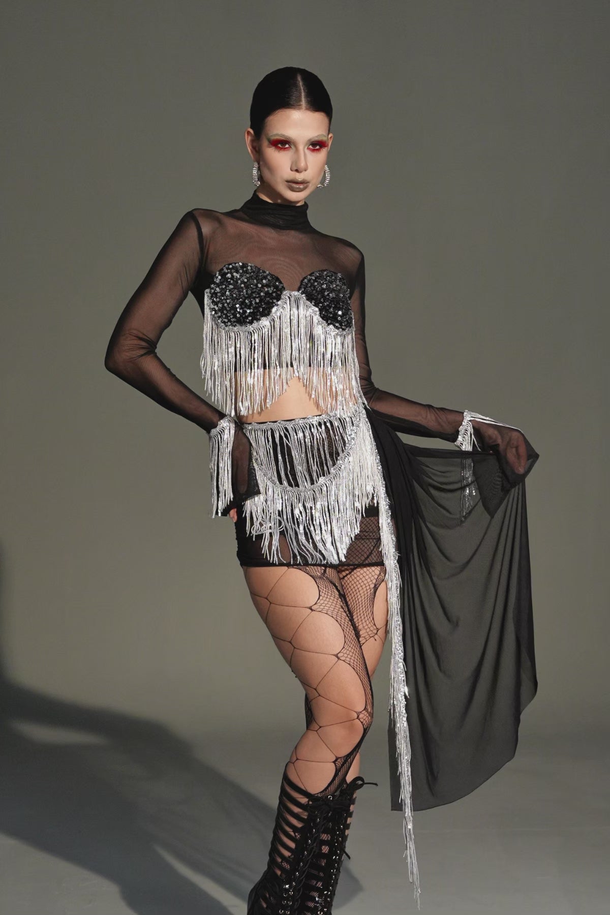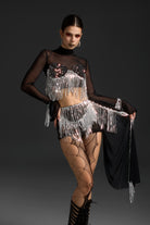 Freja Mesh Fringe Rhinestone Skirt Set-Dynamic Sparkle in Fluid Motion